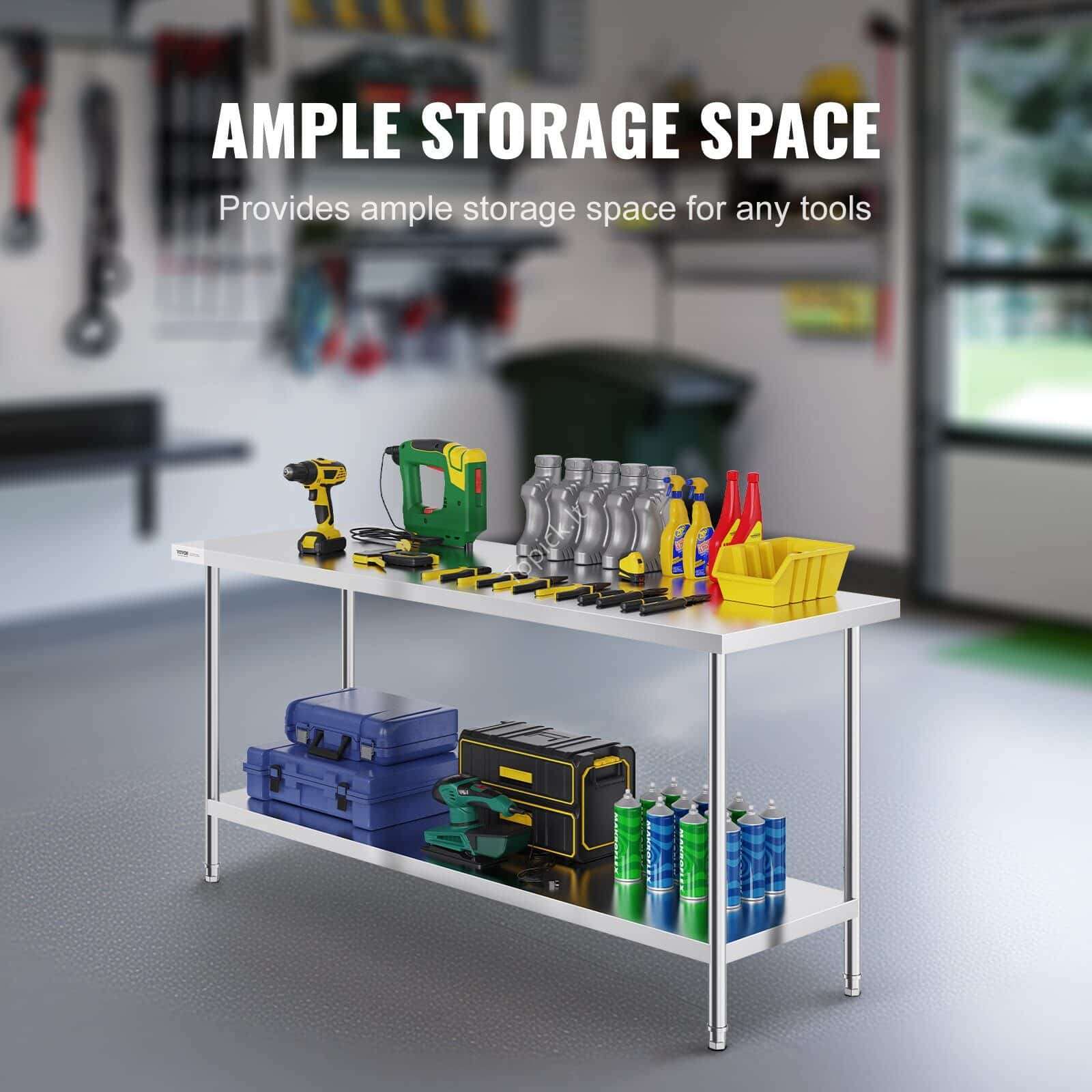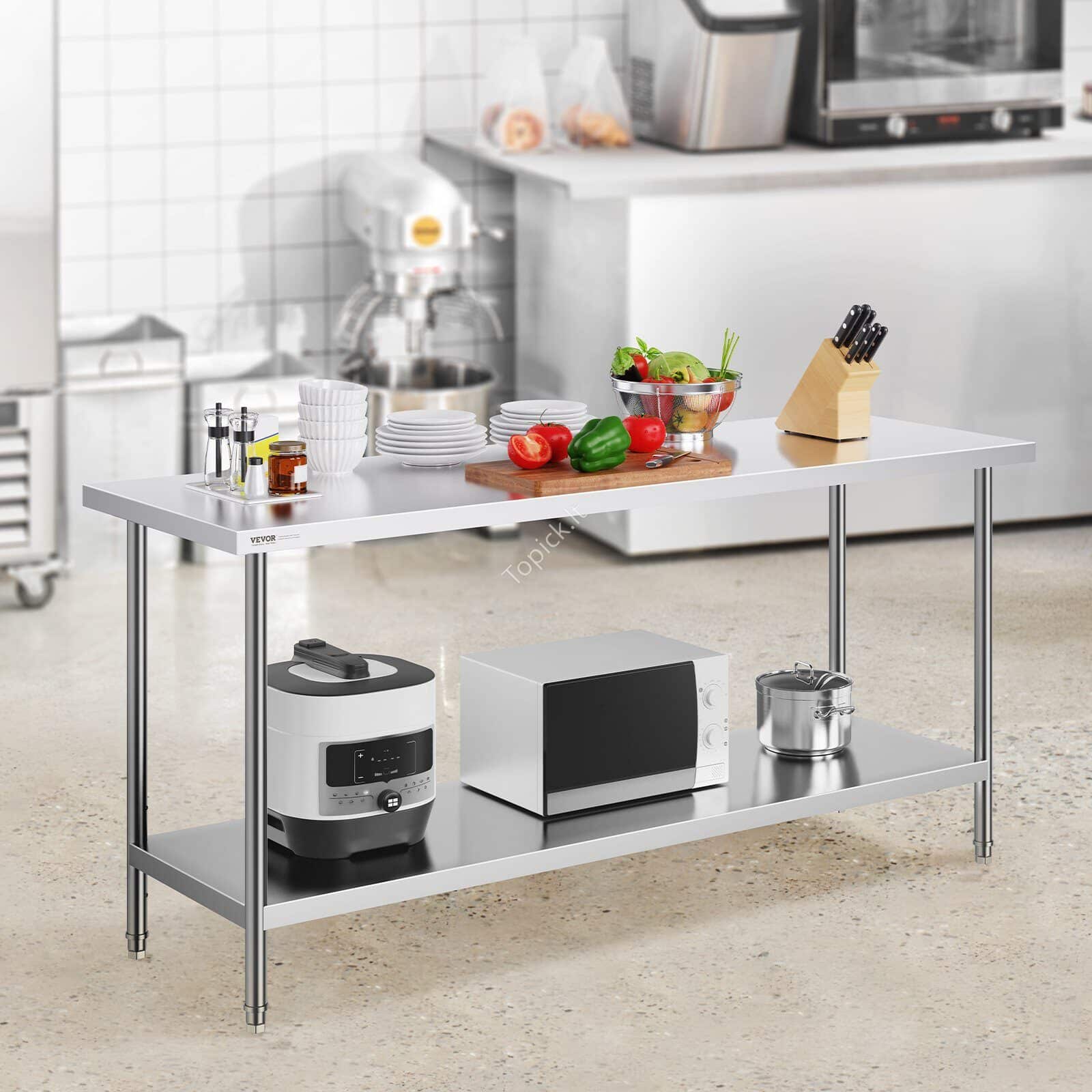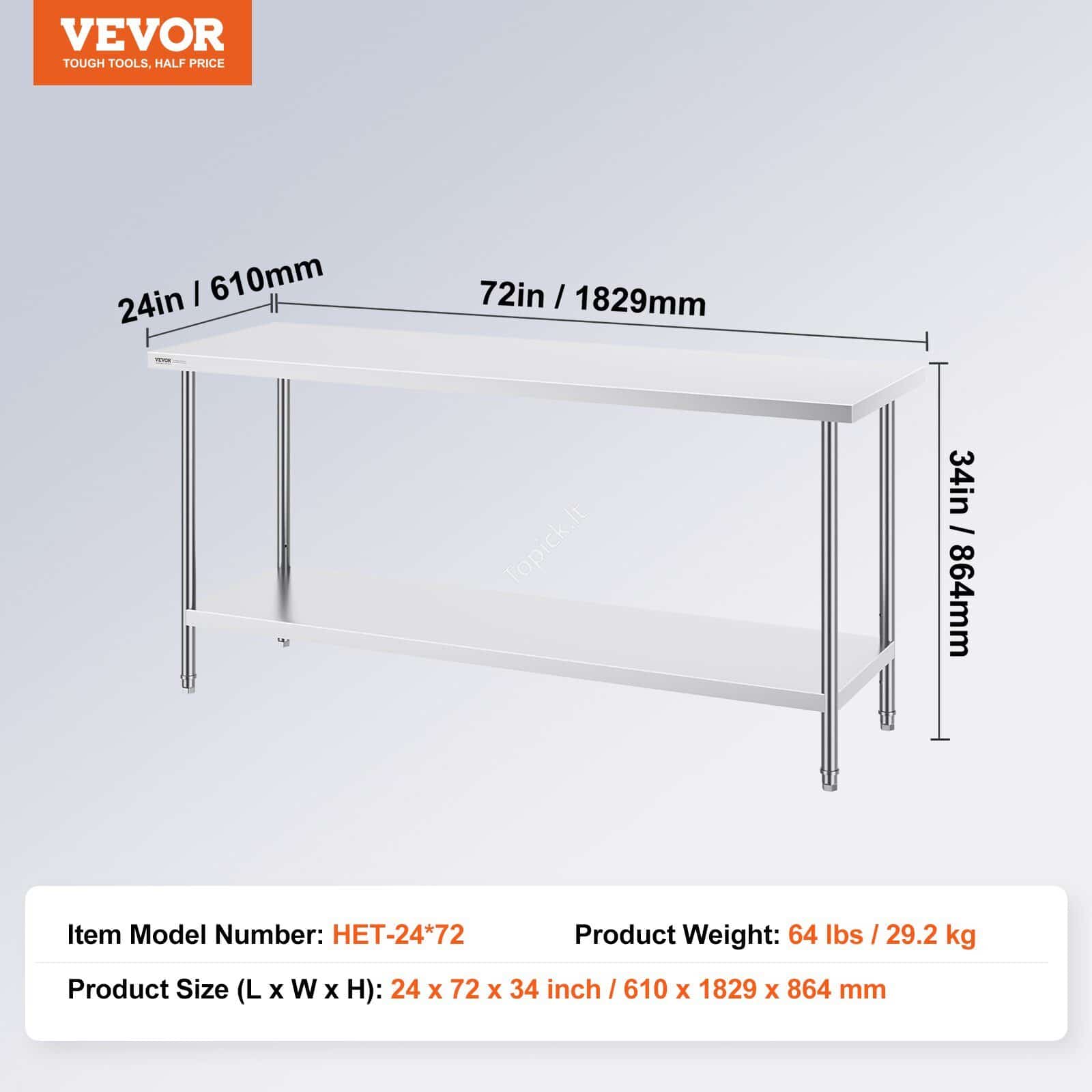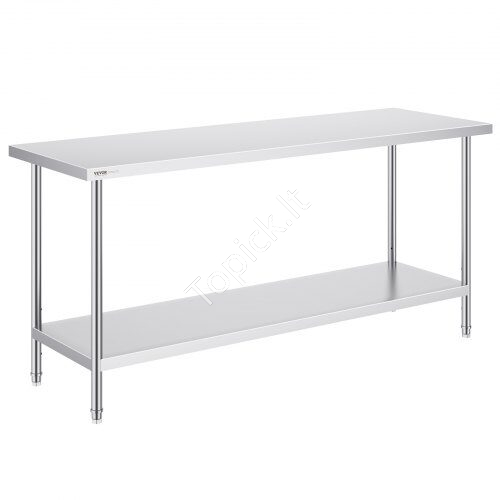 - Aukštos kokybės nerūdijantis plienas: šis 24 x 72 x 34 colių (610 x 1829 x 864 mm) darbo stalas pagamintas iš nerūdijančio plieno SUS201, skirtas stalviršiui, lentynoms ir kojoms. Jis pasižymi puikiu atsparumu rūdijimui, elegantiškai išvaizdai ir lygiam paviršiui, kurį lengva nuvalyti paprastu šluoste.