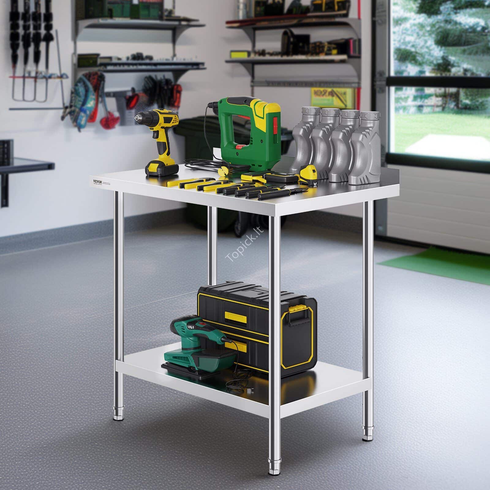 - Aukštos kokybės nerūdijantis plienas: šis darbo stalas, kurio matmenys 24 x 36 x 36 coliai (610 x 914 x 914 mm), yra pagamintas iš SUS201 nerūdijančio plieno, skirtas stalviršiui, lentynoms ir kojoms. Jis pasižymi puikiu atsparumu rūdijimui, elegantiškai išvaizdai ir lygiam paviršiui, kurį lengva nuvalyti paprastu šluoste.