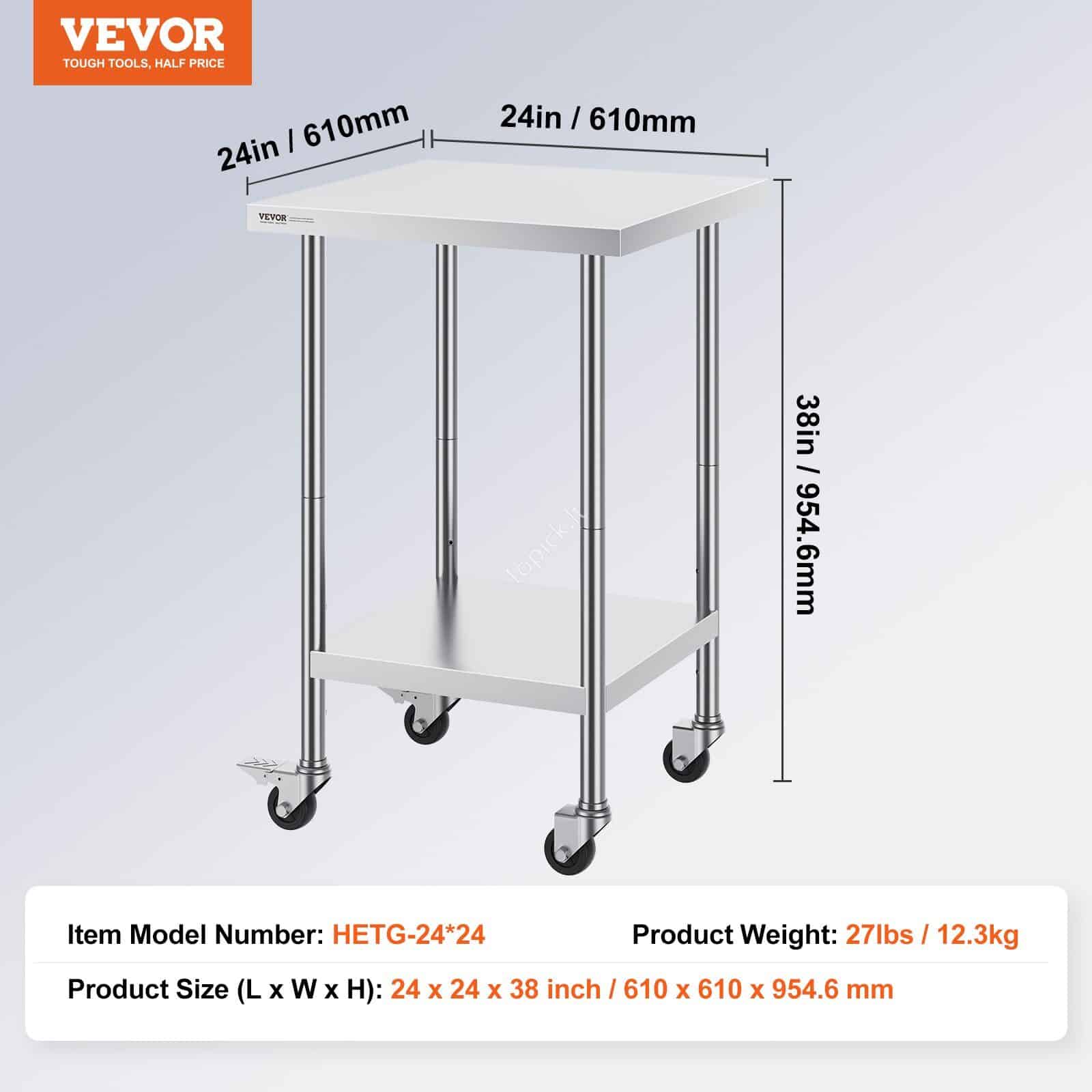 • Aukštos kokybės nerūdijantis plienas: šis darbo stalas, kurio matmenys 24 x 24 x 38 coliai (610 x 610 x 954,6 mm), yra pagamintas iš SUS201 nerūdijančio plieno, skirtas stalviršiui, lentynoms ir kojoms. Jis pasižymi puikiu atsparumu rūdims, elegantiška išvaizda ir lygaus paviršiaus, kurį lengva nuvalyti šluoste.