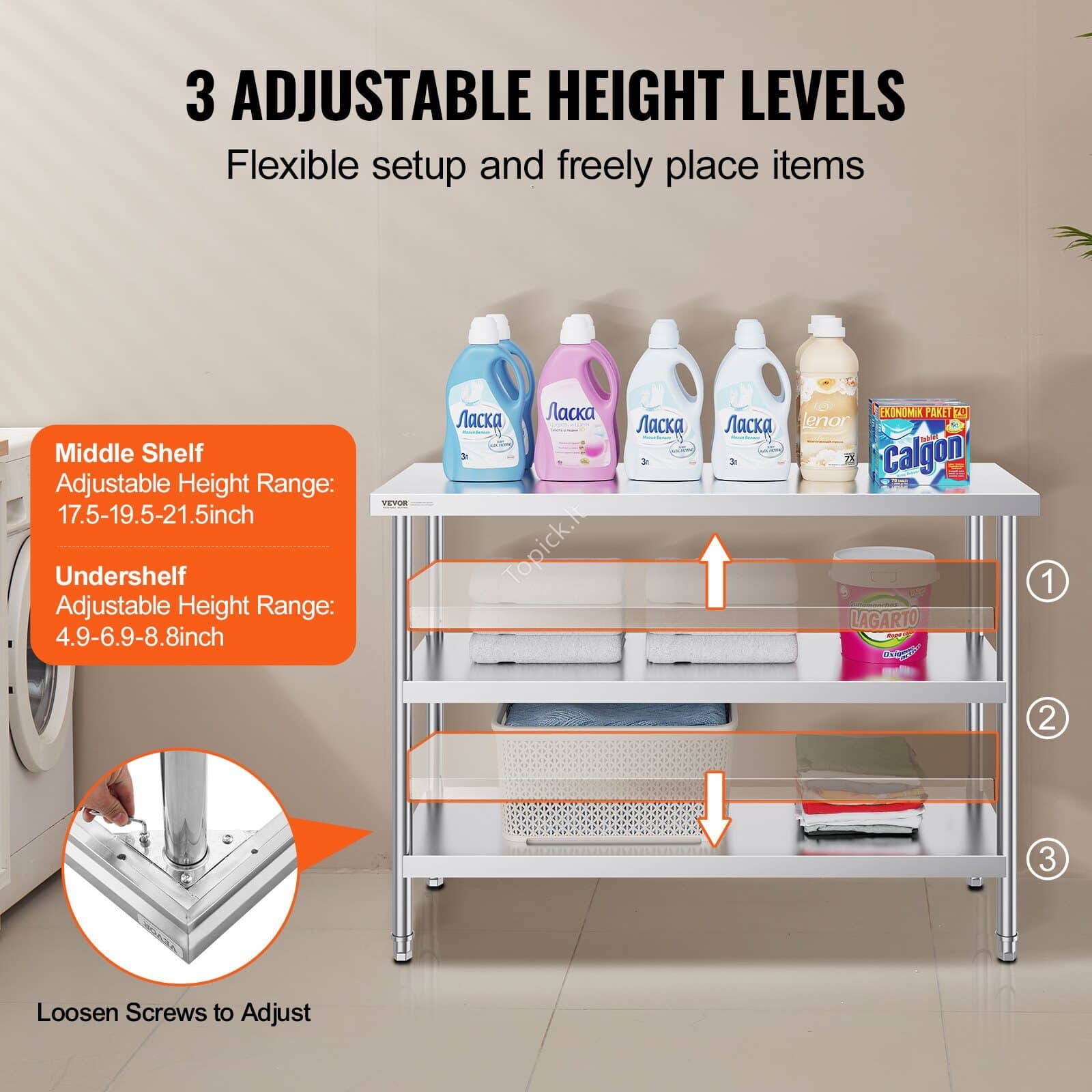 - Aukštos kokybės nerūdijantis plienas: šis 18 x 48 x 34 colių (457 x 1219 x 864 mm) darbo stalas pagamintas iš nerūdijančio plieno SUS201, skirtas stalviršiui, lentynoms ir kojoms. Jis pasižymi puikiu atsparumu rūdijimui, elegantiškai išvaizdai ir lygiam paviršiui, kurį lengva nuvalyti paprastu šluoste.