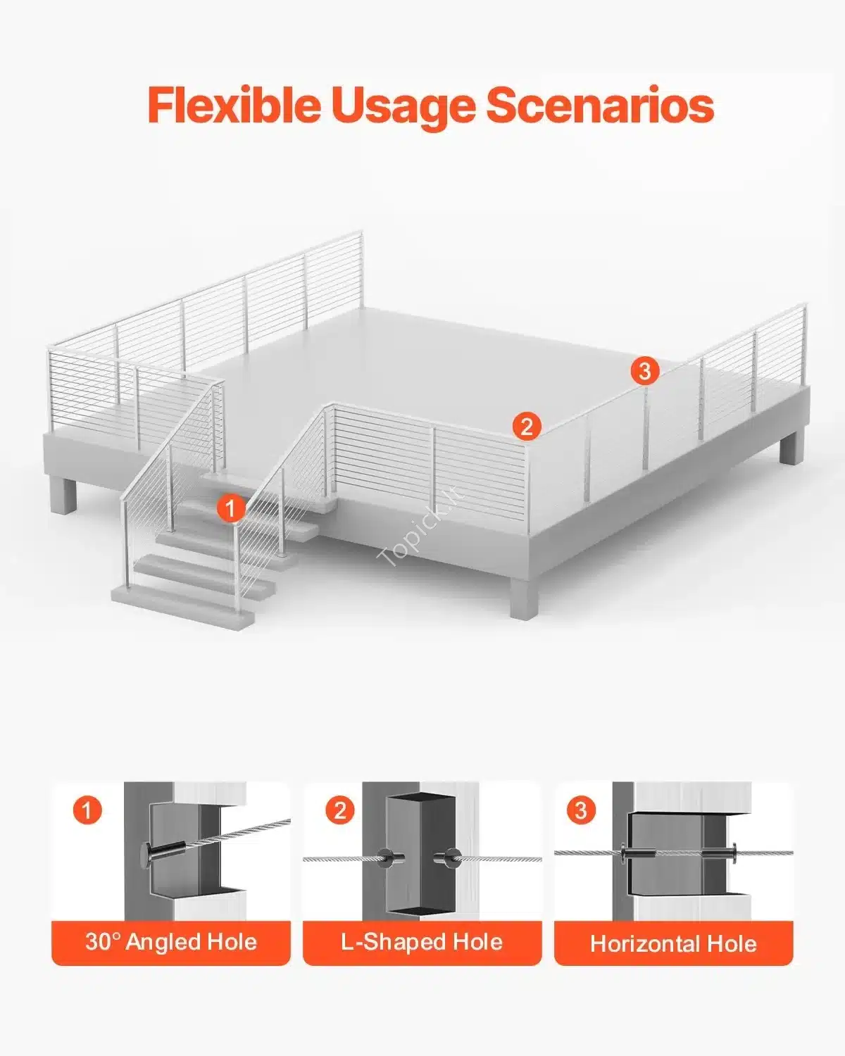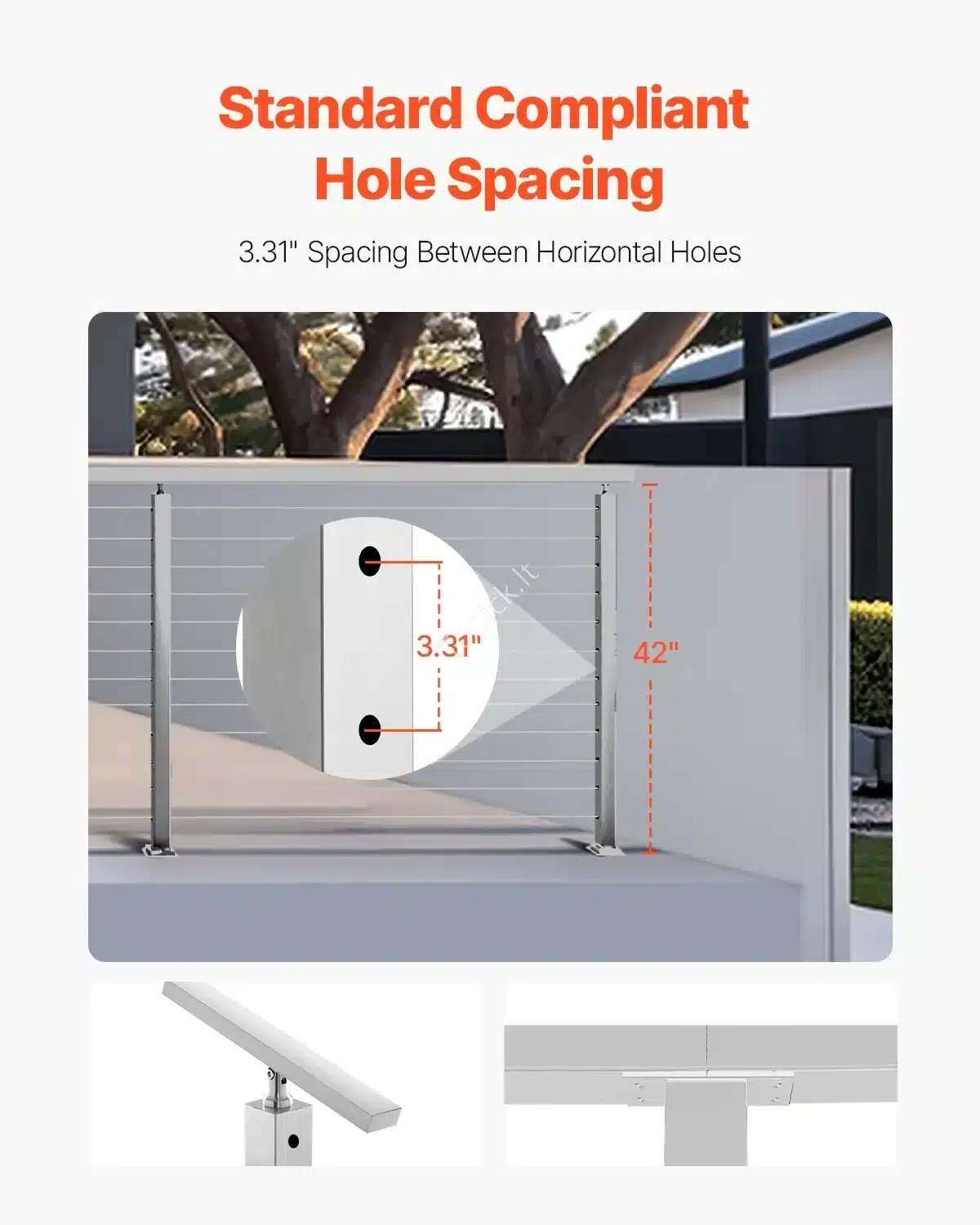 - Universalumas: Tinka naudoti ant laiptų, denių, balkonų, terasų ir kitose vietose, kur reikalinga patikima atrama. Trosų skylių tarpai yra 84 mm.