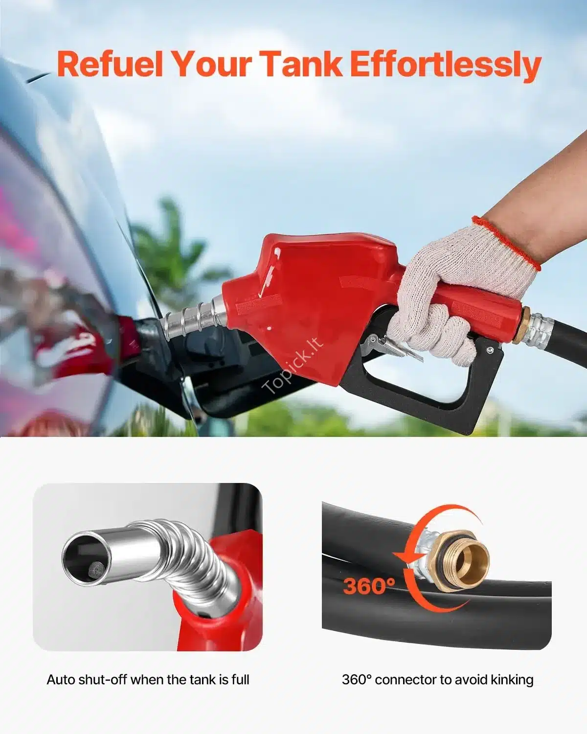 - Patogumas: Automatinis kuro pistoletas apsaugo nuo perpildymo. Baką lengva transportuoti su šoninėmis rankenomis ir kišenėmis šakiniam krautuvui.