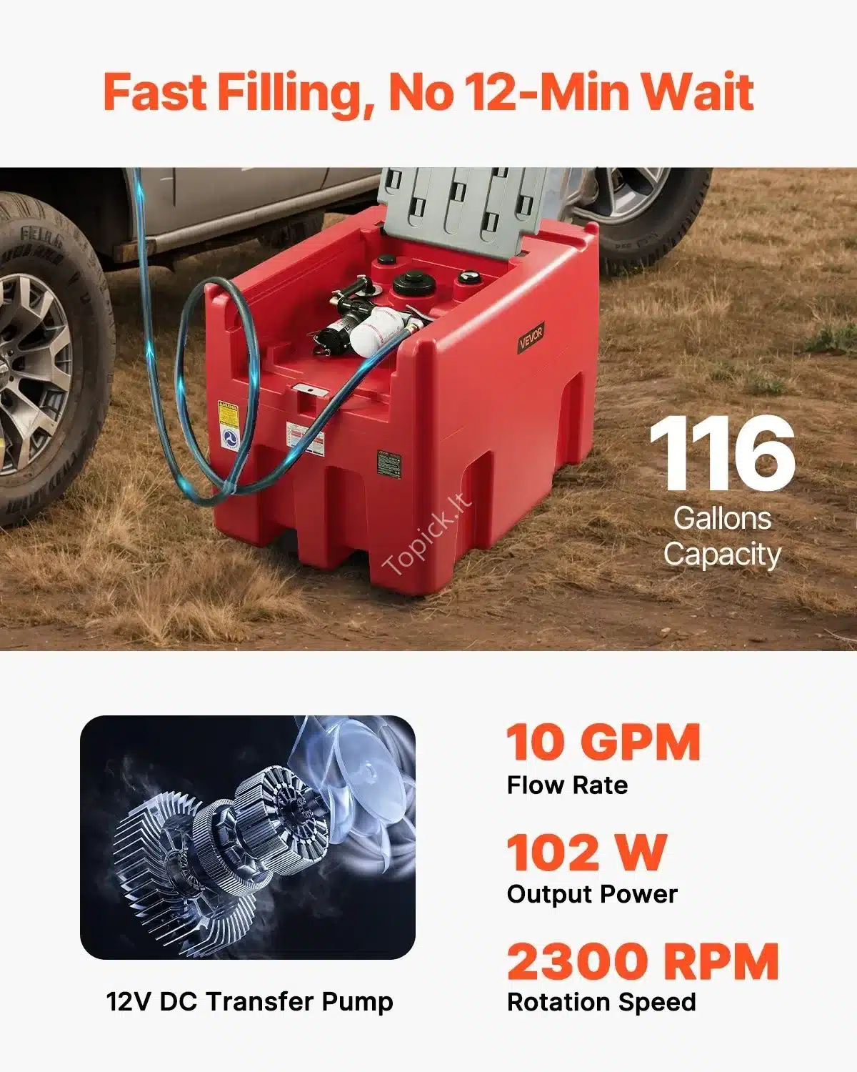 - Patogumas: Automatinis kuro pistoletas apsaugo nuo perpildymo. Baką lengva transportuoti su šoninėmis rankenomis ir kišenėmis šakiniam krautuvui.