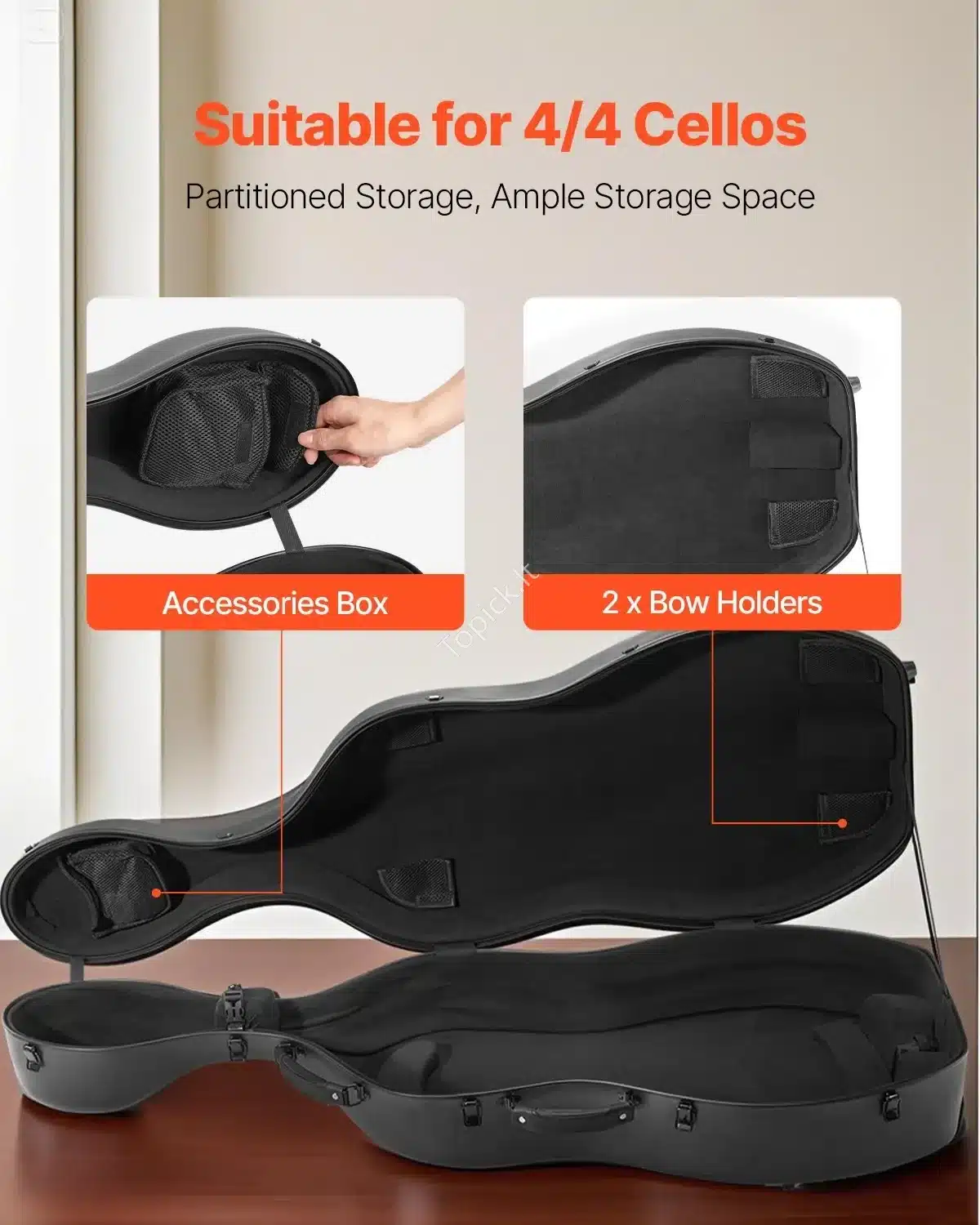 Dėklo viduje yra paminkštintas pamušalas ir specialus kakliuko laikiklis, kuris užtikrina, kad instrumentas tvirtai laikytųsi vietoje ir neslystų transportuojant. Lagaminas turi du patogius lankų laikiklius, o papildomi skyriai leidžia tvarkingai laikyti priedus – kolofoniją, stygas ar derintuvą. Lagamino forma pritaikyta violončelės siluetui, o tvirti diržai leidžia jį nešioti kaip kuprinę, sumažinant apkrovą pečiams.