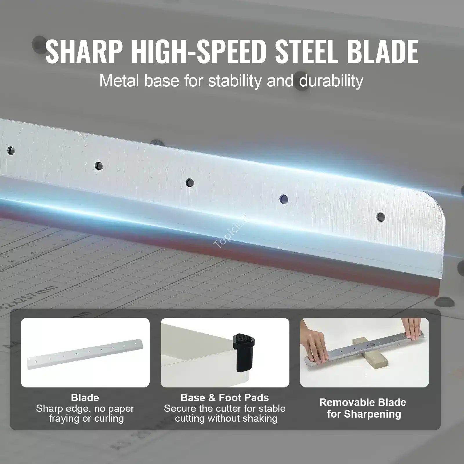 - Greitis ir Tikslumas: Patogus liniuotės kreiptuvas ir praktiškas popieriaus prispaudimo sraigtas leidžia greitai ir be vargo išlyginti popierių ir užtikrinti maksimalų pjovimo tikslumą.