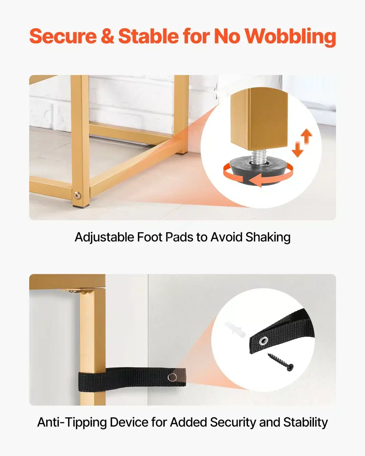 - Apsauga Jūsų Namams: Staliukas komplektuojamas su reguliuojamais pėdų padukais, kad stabiliai stovėtų ant nelygių grindų, ir apsauga nuo apvirtimo, užtikrinančia saugumą.