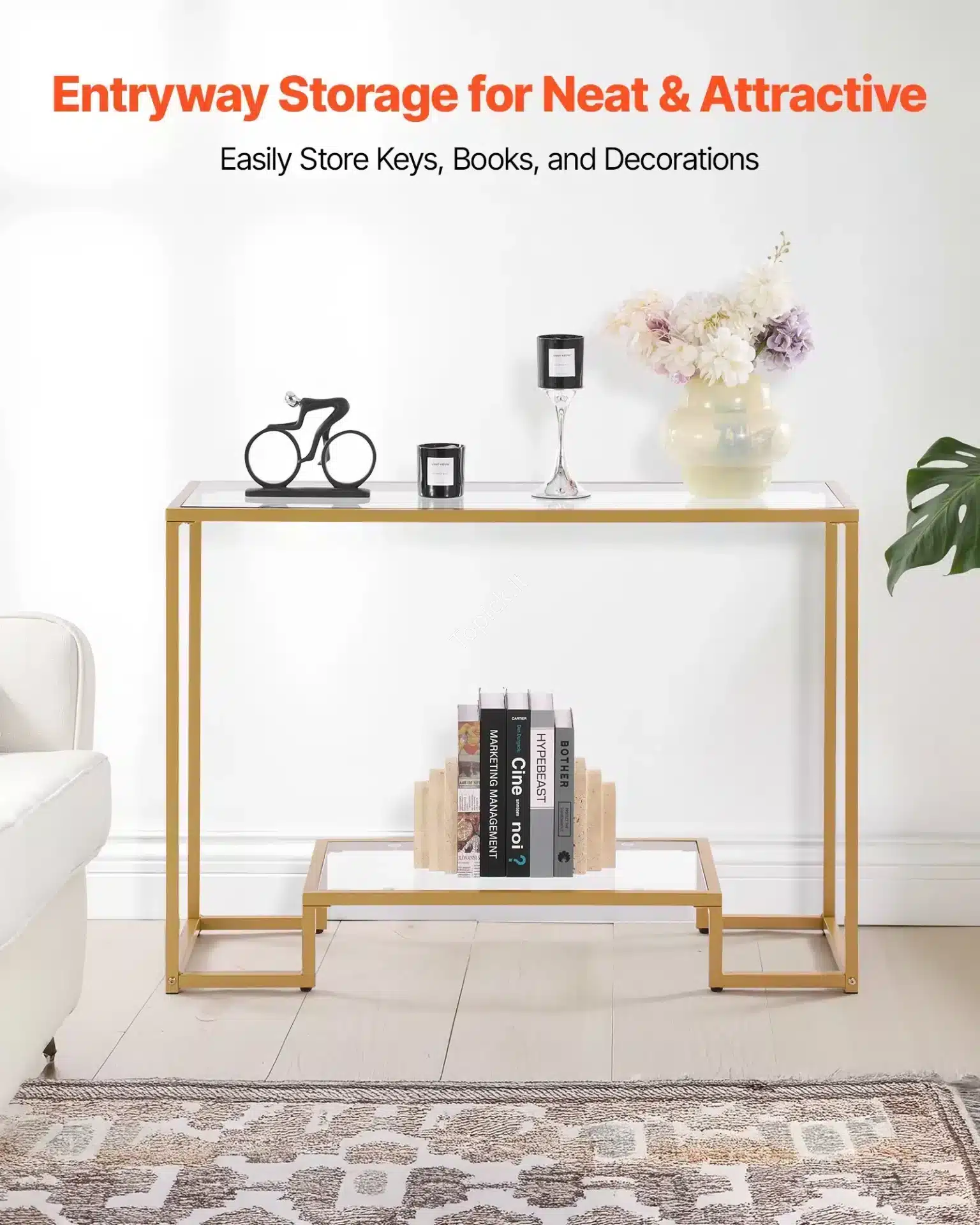 Ieškai baldo, kuris ne tik puoštų tavo namus, bet ir maksimaliai išnaudotų erdvę? Šis dviejų lygių, aukso spalvos konsolinis staliukas yra elegantiškas ir praktiškas pasirinkimas! Puikiai tinka statyti prieškambaryje, fojė, svetainėje už sofos ar net miegamajame. Dėl siauro dizaino ir dviejų stiklinių lygių jis suteiks namams prabangos, vizualiai neapkraudamas erdvės.