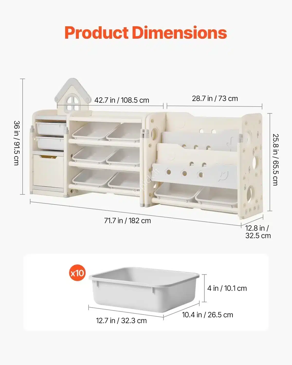 Daugiafunkcinė Vaikų Žaislų Lentyna su 10 Dėžių ir Knygų Saugykla. HDPE Medžiaga, Smėlio/Pilka, 182 x 33 x 91,5 cm