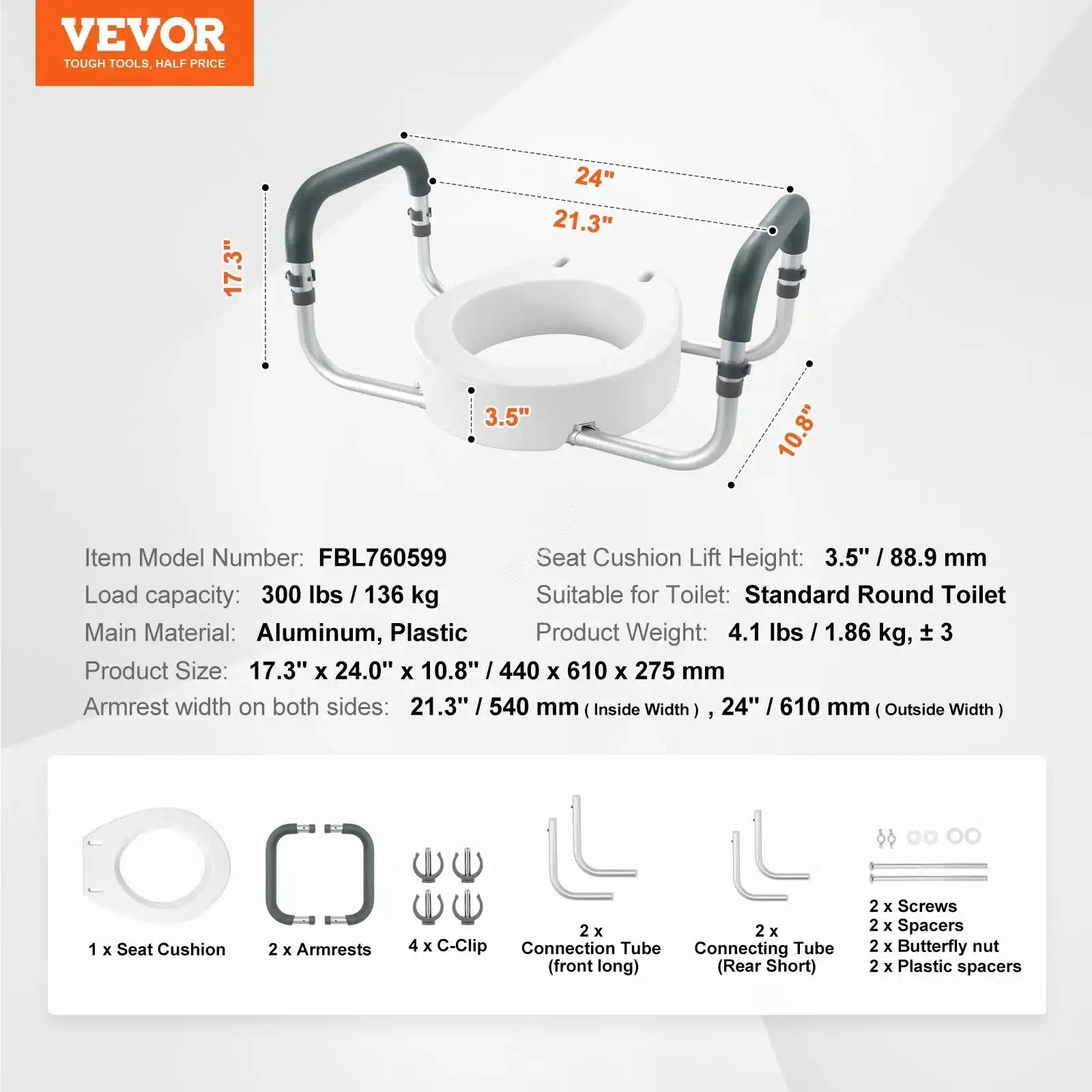 Pakeliamas tualeto dangtis su aliuminio porankiais (8.9 cm aukščio), 136 kg, Tinka apvaliam tualetui, Baltas/pilkas plastikas – (Tualeto sėdynės paaukštinimas)