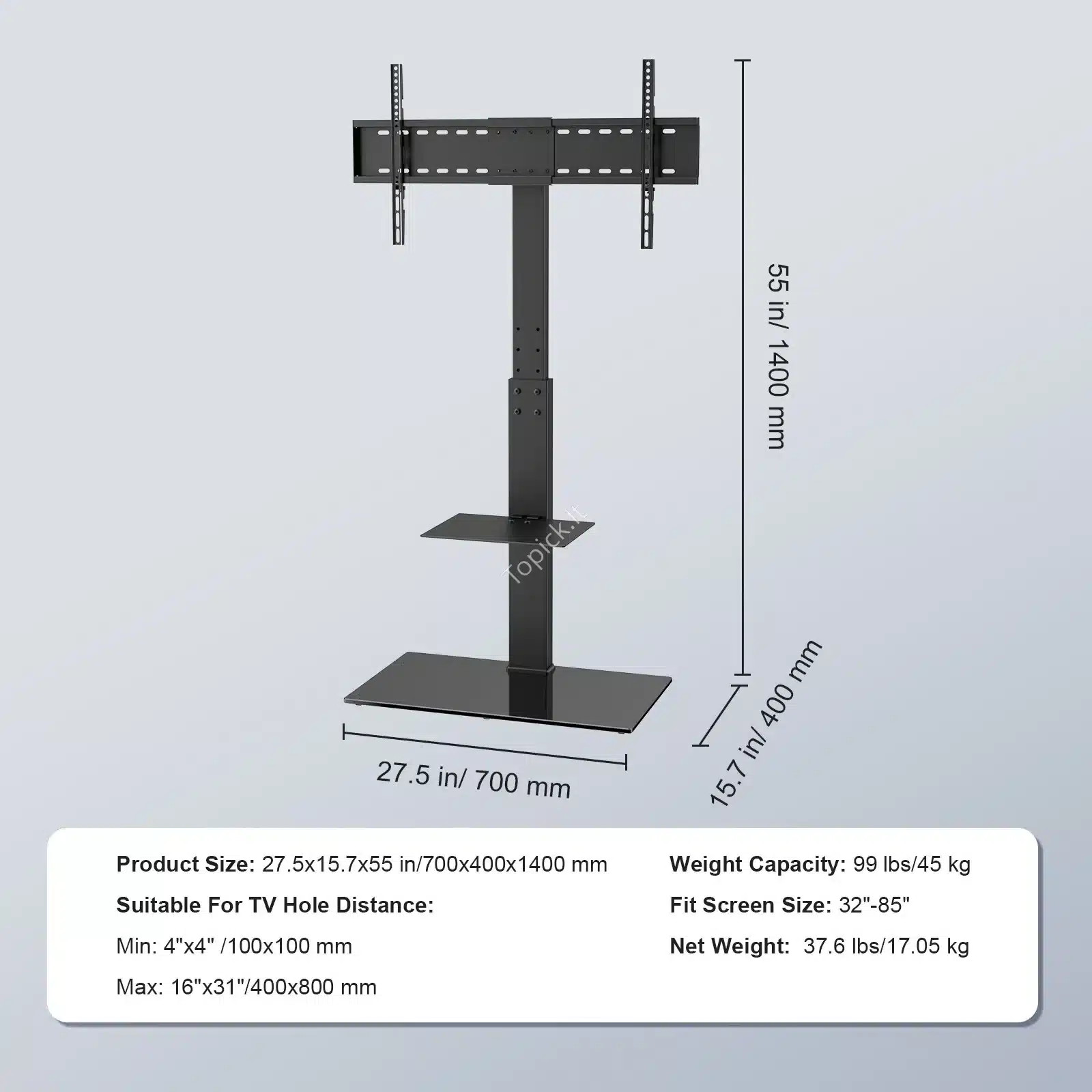 Pamiršk sienų gręžimą ir varginančius montavimus! Šis metalinis televizoriaus stovas yra modernus ir mobilus sprendimas, tinkantis beveik bet kuriam dideliam televizoriui – nuo 32 iki net 85 colių (iki 45 kg svorio). Jis puikiai atrodys tiek svetainėje, tiek miegamajame, o prireikus, be vargo jį pastumsi į kitą vietą.