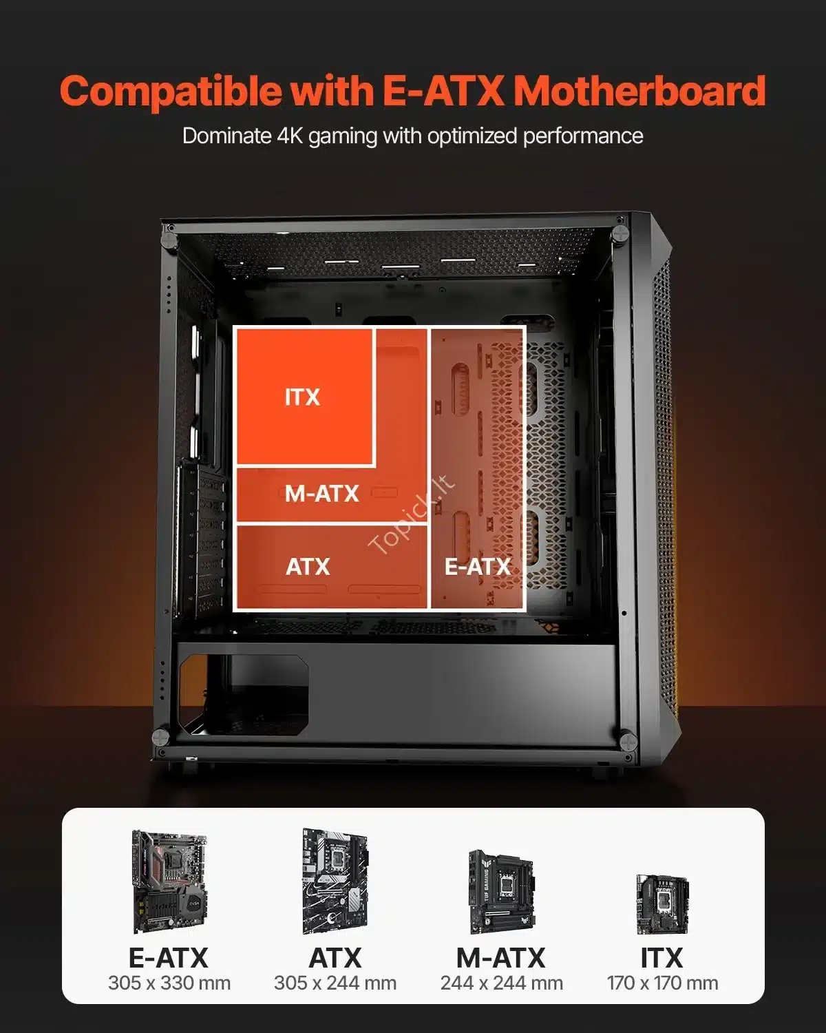- Suderinamumas: Tinka E-ATX, ATX, M-ATX ir Mini-ITX pagrindinėms plokštėms.