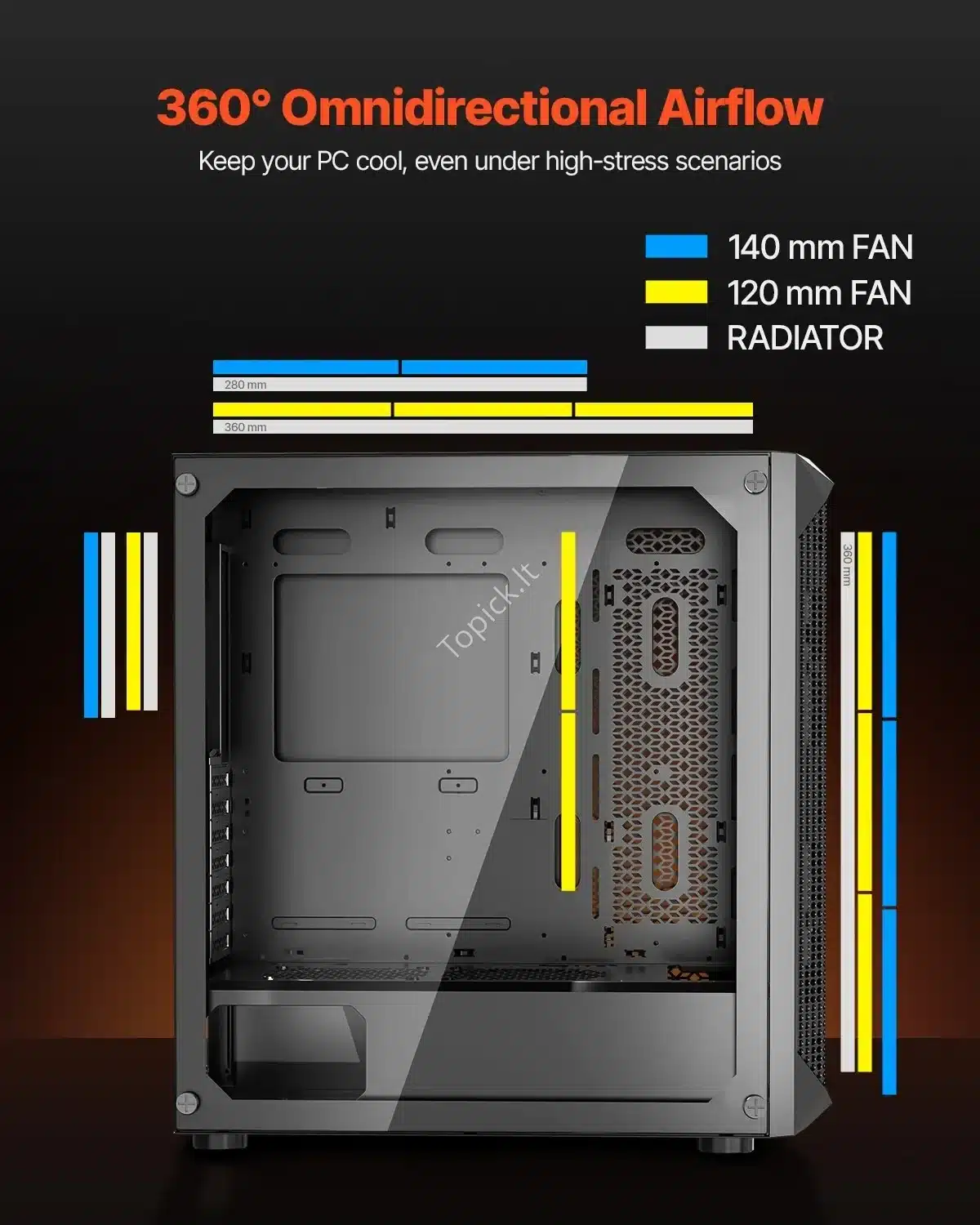 - Ventiliatoriai: Komplekte yra 3 x 140 mm PWM ventiliatoriai. Korpusas palaiko iki devynių 120 mm arba šešių 140 mm ventiliatorių.
