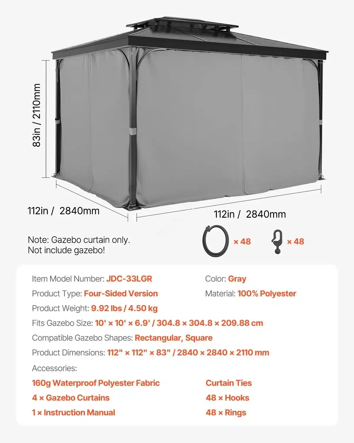 Pilkos spalvos 4 dalių pavėsinės užuolaidos 284 × 284 × 211 cm – vandeniui atsparios, su užtrauktuku ir aliuminio žiedais