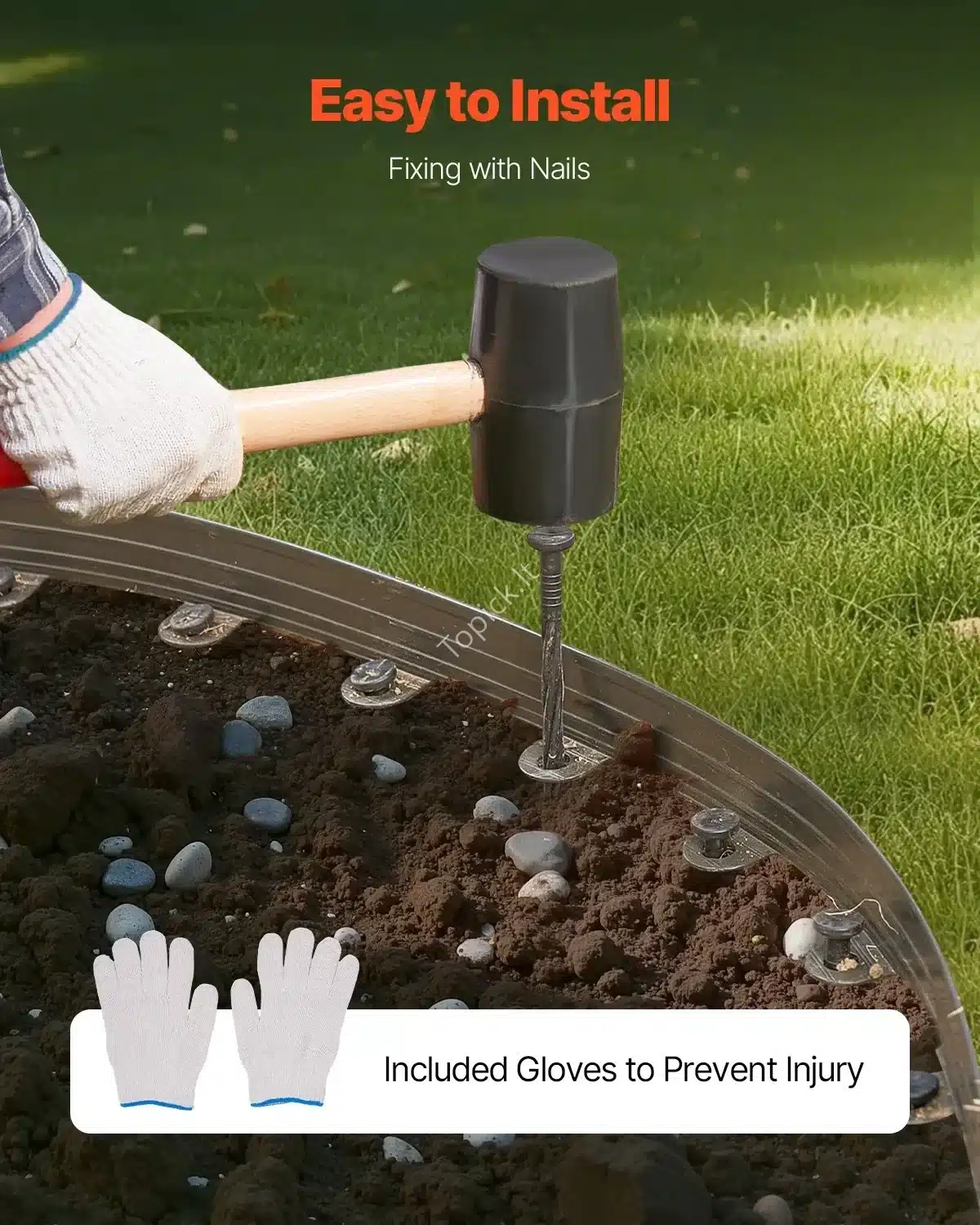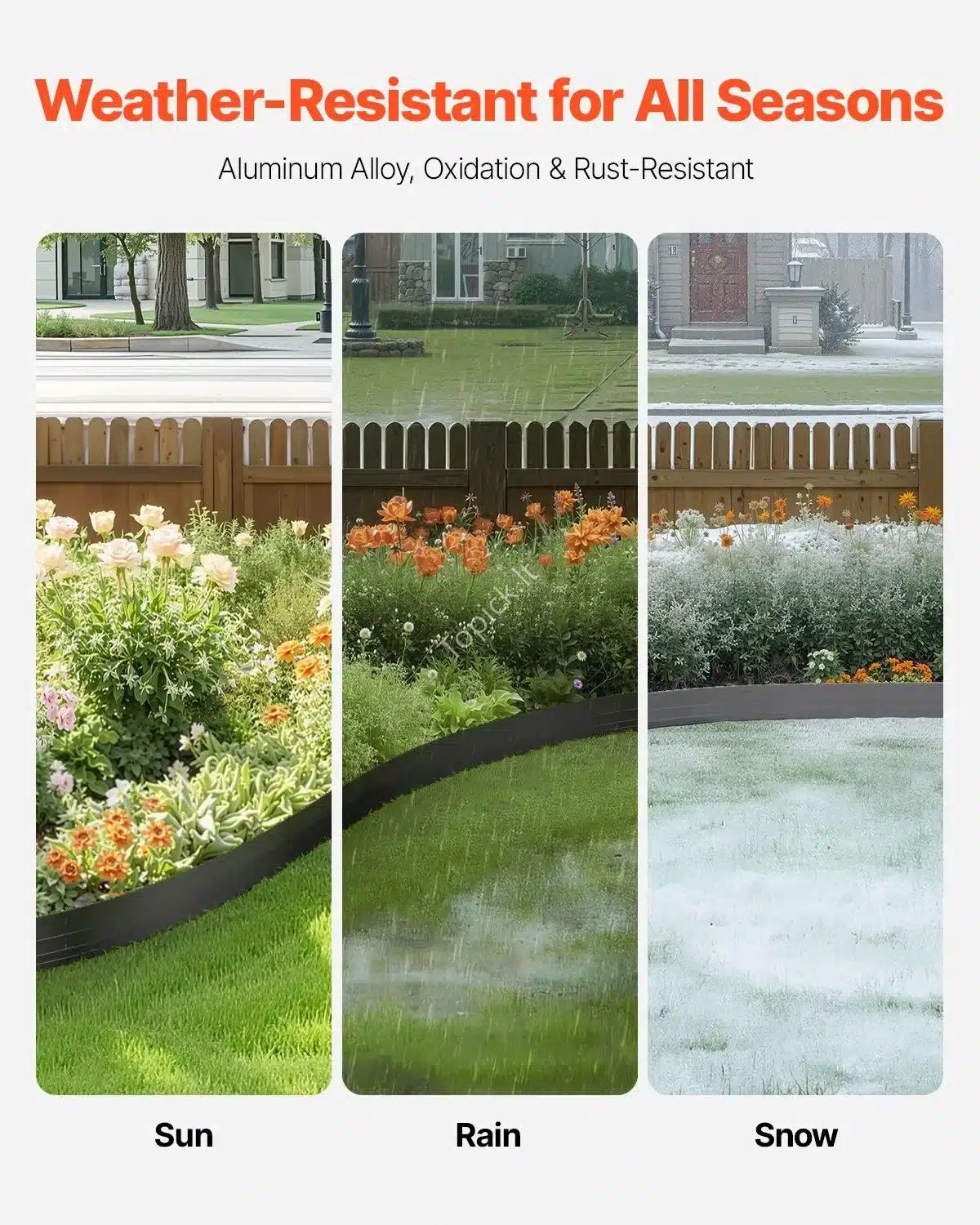 Aukštos kokybės plieninės kraštinės, skirtos tvarkingam vejos, gėlynų ar takų atskyrimui. Kiekviena juosta yra 152,4 cm ilgio ir 10,9 cm aukščio, todėl visas komplektas suteikia daugiau nei 15 metrų bendro krašto. Pagamintos iš rūdžiai atsparaus plieno su patvaria milteline danga, užtikrinančia ilgaamžį naudojimą visus metus. Lanksti konstrukcija leidžia formuoti tiek tiesias, tiek išlenktas linijas, o montavimas paprastas – tereikia įkalti kraštines į žemę.