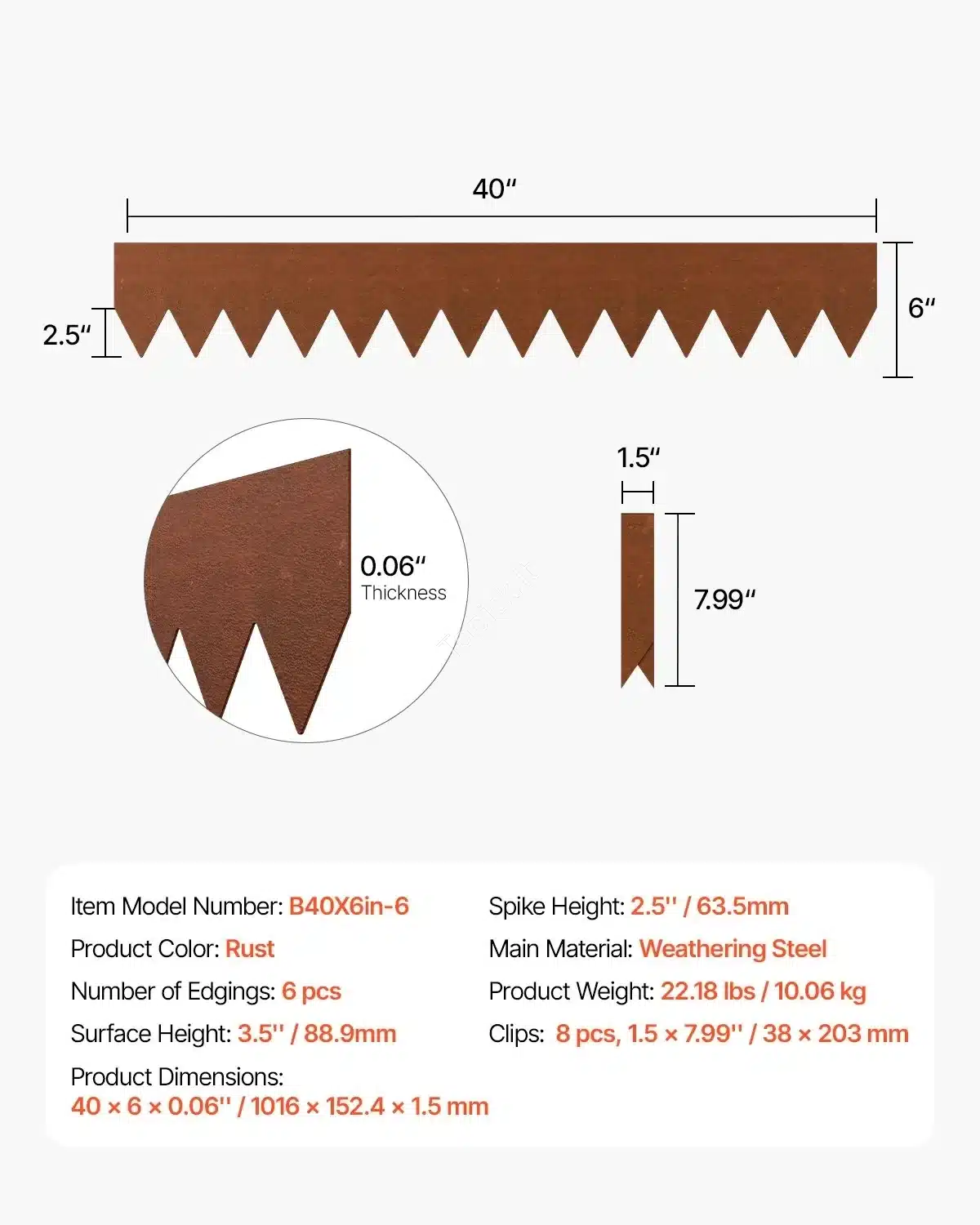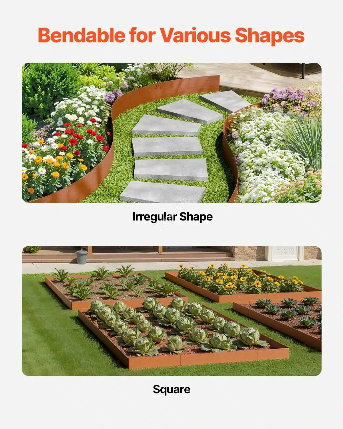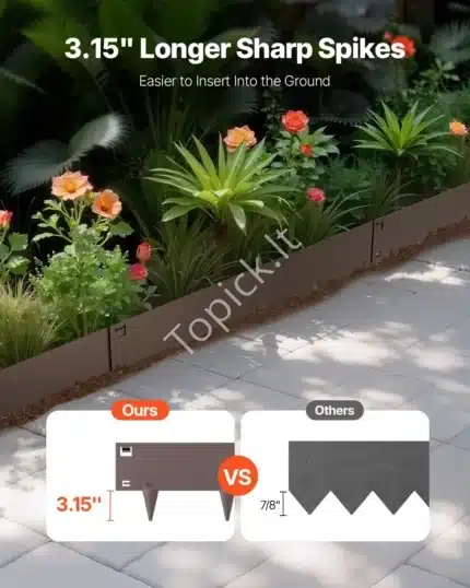 Aukštos kokybės plieninės kraštinės skirtos tvarkingam vejos, gėlynų ar takų atskyrimui. Komplekte yra 6 juostos, kiekvienos ilgis 101,6 cm ir aukštis 15,2 cm, todėl bendras ilgis siekia daugiau nei 6 metrus. Pagamintos iš cinkuoto, milteliniu būdu padengto plieno, atsparios rūdims ir oro sąlygoms, užtikrina ilgaamžį naudojimą visus metus. Lanksti konstrukcija leidžia formuoti tiesias arba išlenktas linijas pagal poreikį. Montavimas paprastas – pridedami tvirtinimo elementai ir pirštinės patogiam darbui.