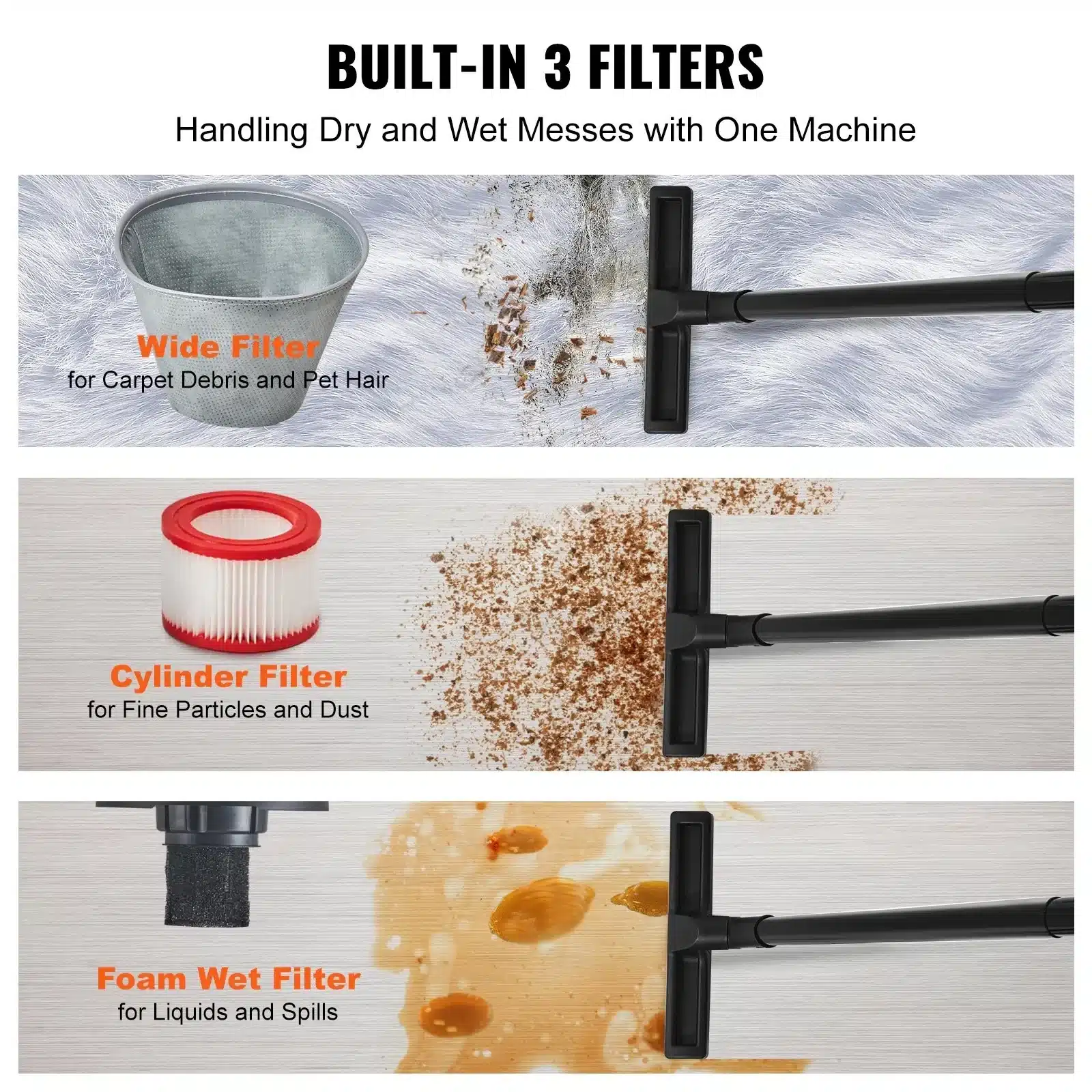 - Filtravimas: Trys skirtingi filtrai, pritaikyti sausam ir šlapiam valymui.