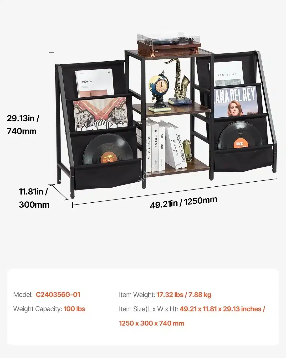 Pramoninis Vinilo Plokštelių Stovas Lentyna Grotuvui, Juodas Metalas/Ruda Mediena