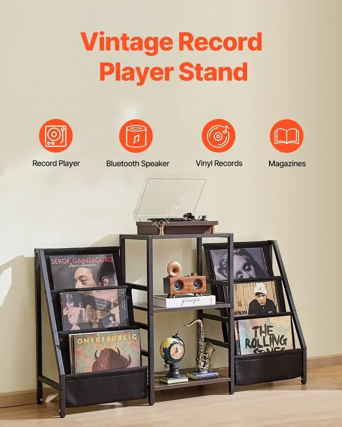 - Stilius ir Funkcionalumas: Stovas tarnauja ne tik kaip plokštelių laikiklis, bet ir kaip stilingas šoninis ar konsolinis staliukas. Jo minimalistinis, bet tvirtas dizainas puikiai tiks moderniuose ir pramoninio stiliaus namuose.