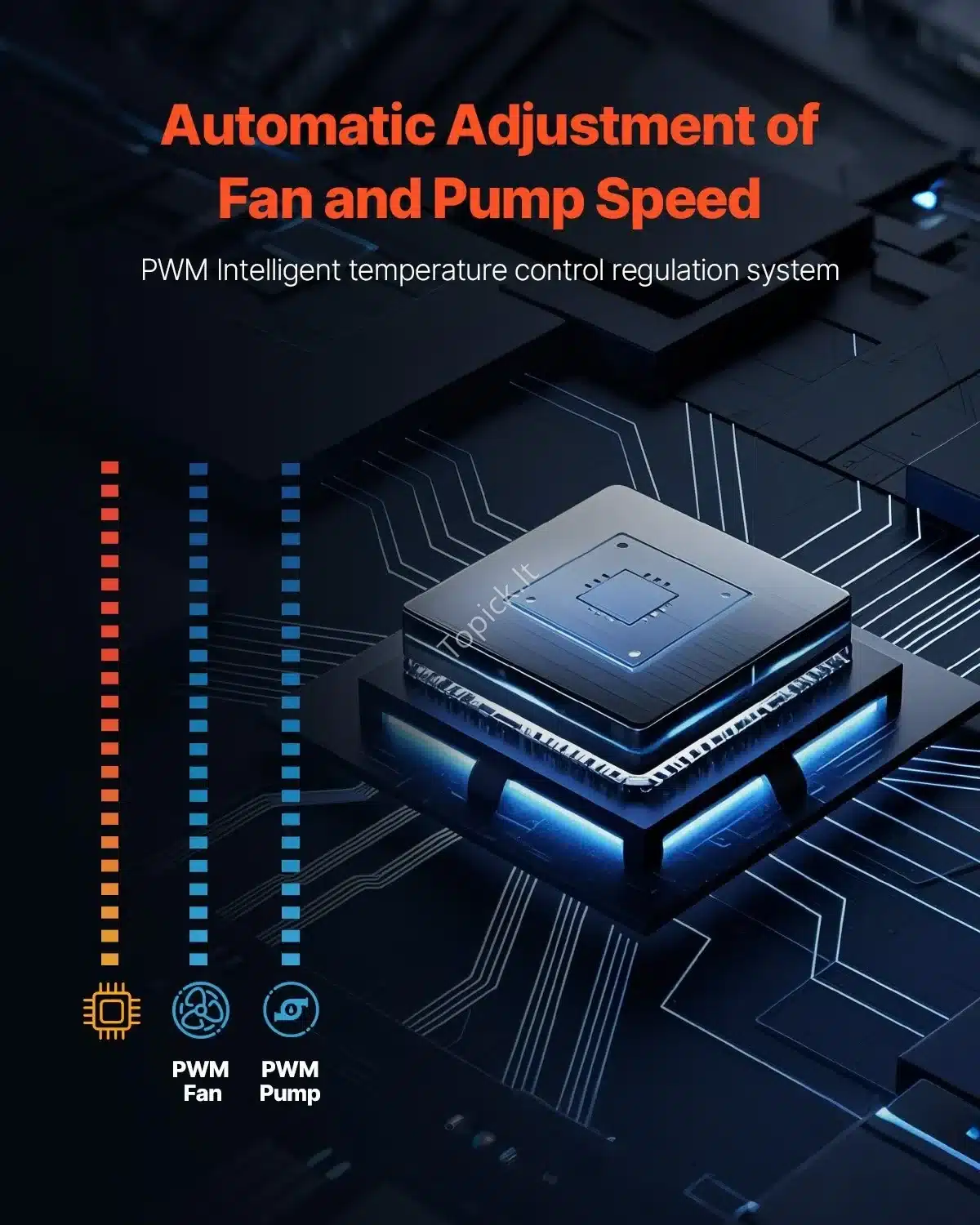 - Valdymas: PWM sistema automatiškai reguliuoja siurblio ir ventiliatorių greitį pagal procesoriaus temperatūrą.