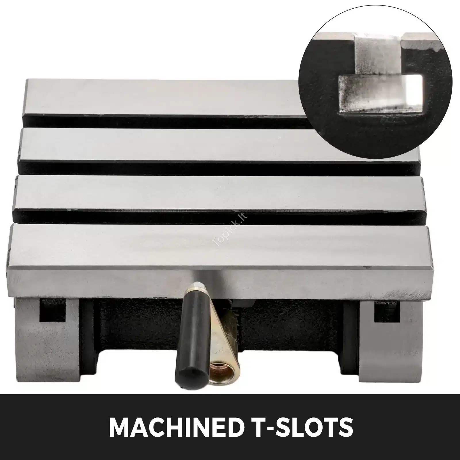 - 🔗 T-formos Fiksavimas: Darbiniame paviršiuje įrengti trys 12 mm pločio T-grioveliai, kurie leidžia ruošinius ar spaustuvus tvirtinti itin saugiai ir tvirtai, kad jie nejudėtų apdirbimo metu.