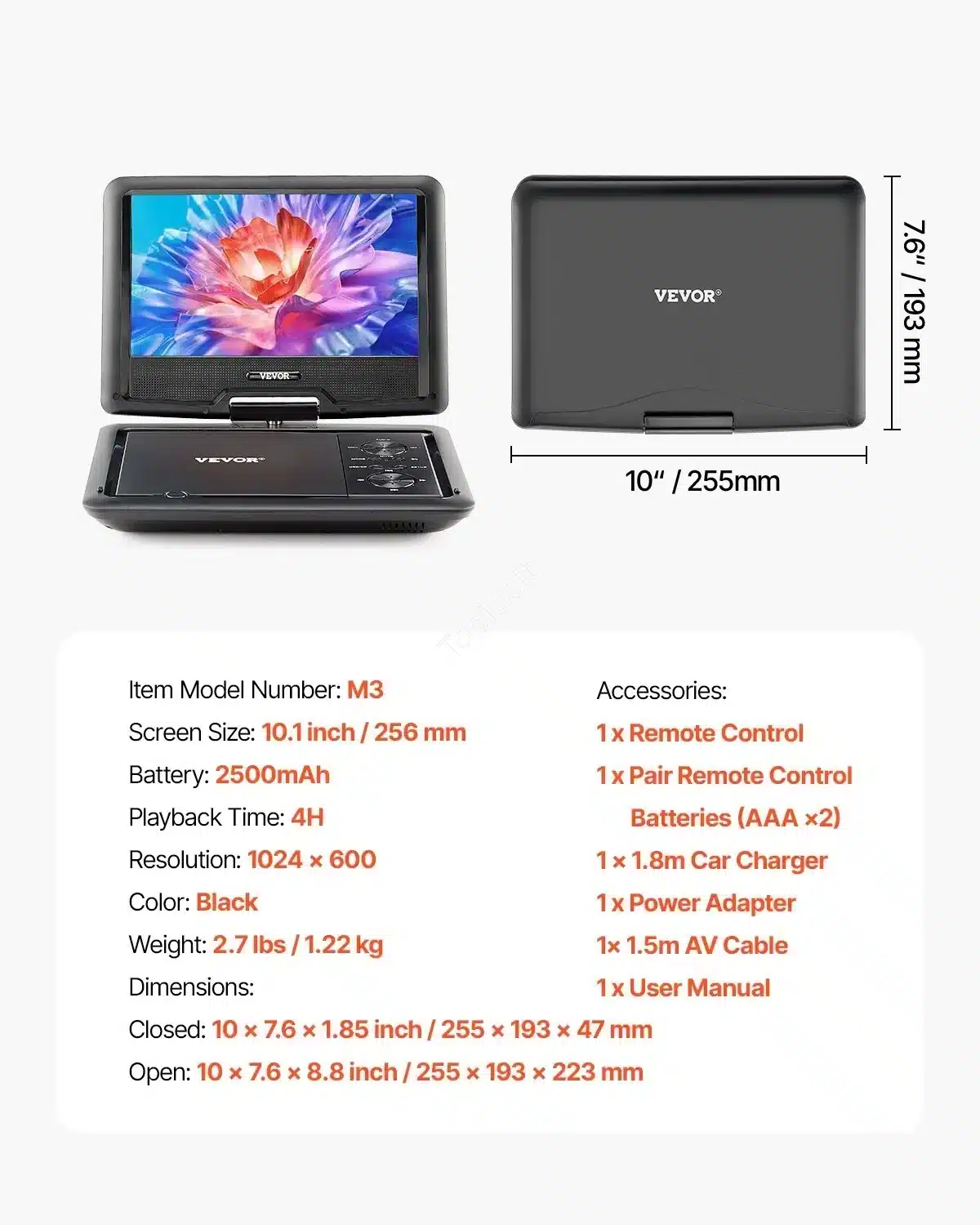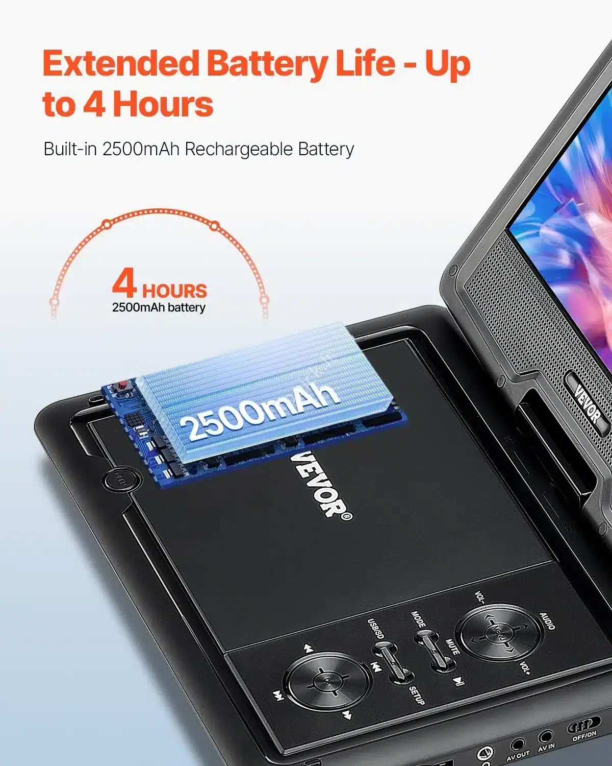 Nešiojamas DVD Grotuvas 💻 25,6 cm (10,1 col.) HD Ekranas (1024×600), Sukiojamas 270°, 4 val. Baterija (2500 mAh), Juodas