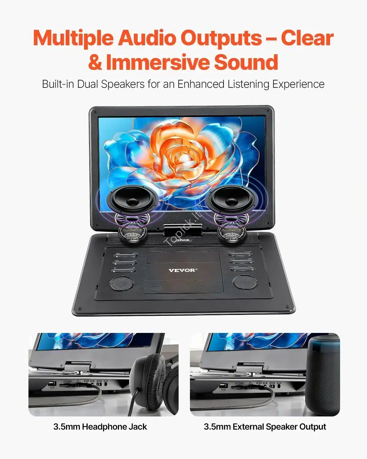 - Daugiaformatis Palaikymas: Be diskų, lengvai atkuria mediją per USB ir SD korteles (iki 32 GB). Palaikomi formatai: MPEG1, MPEG2, MPEG4 (video), MP3, WMA (audio), JPEG, JPG (nuotraukos).