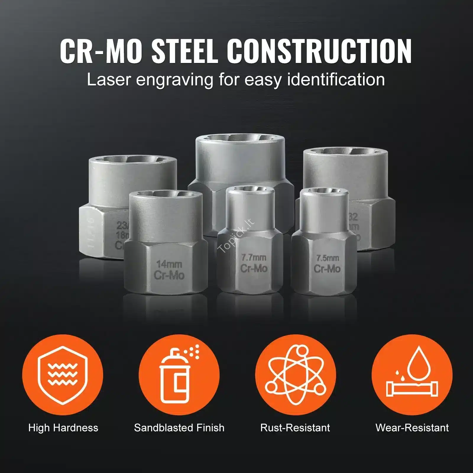 • Itin Tvirtas CR-MO Plienas: Išsukimo galvutės pagamintos iš Chrom-Molibdeno plieno, žinomo dėl savo atsparumo didelėms apkrovoms, lūžiams ir dilimui. Smėliasrove apdorotas paviršius papildomai apsaugo nuo rūdžių.