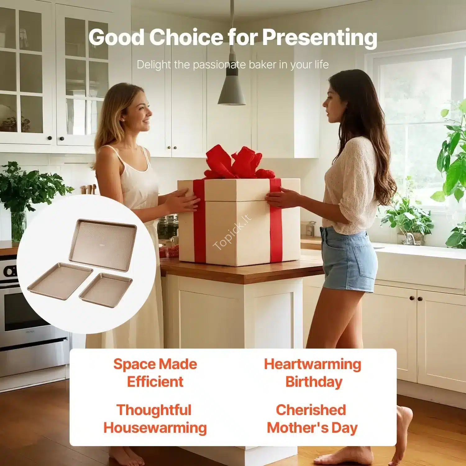 Ieškai aukščiausios kokybės kepimo indų? Šis 3 dalių kepimo formų rinkinys yra ne tik funkcionalus, bet ir atrodo puikiai! Auksinė spalva suteiks elegancijos tavo virtuvei, o storas anglinis plienas užtikrins ilgametį patikimumą.