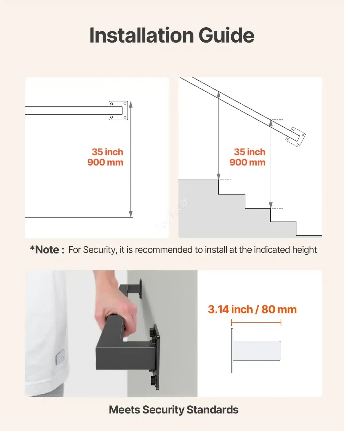 - Lengvas montavimas: Pridedami visi reikalingi tvirtinimo įrankiai, todėl turėklą lengva sumontuoti ant įvairių paviršių: medžio, plytų ar betono.