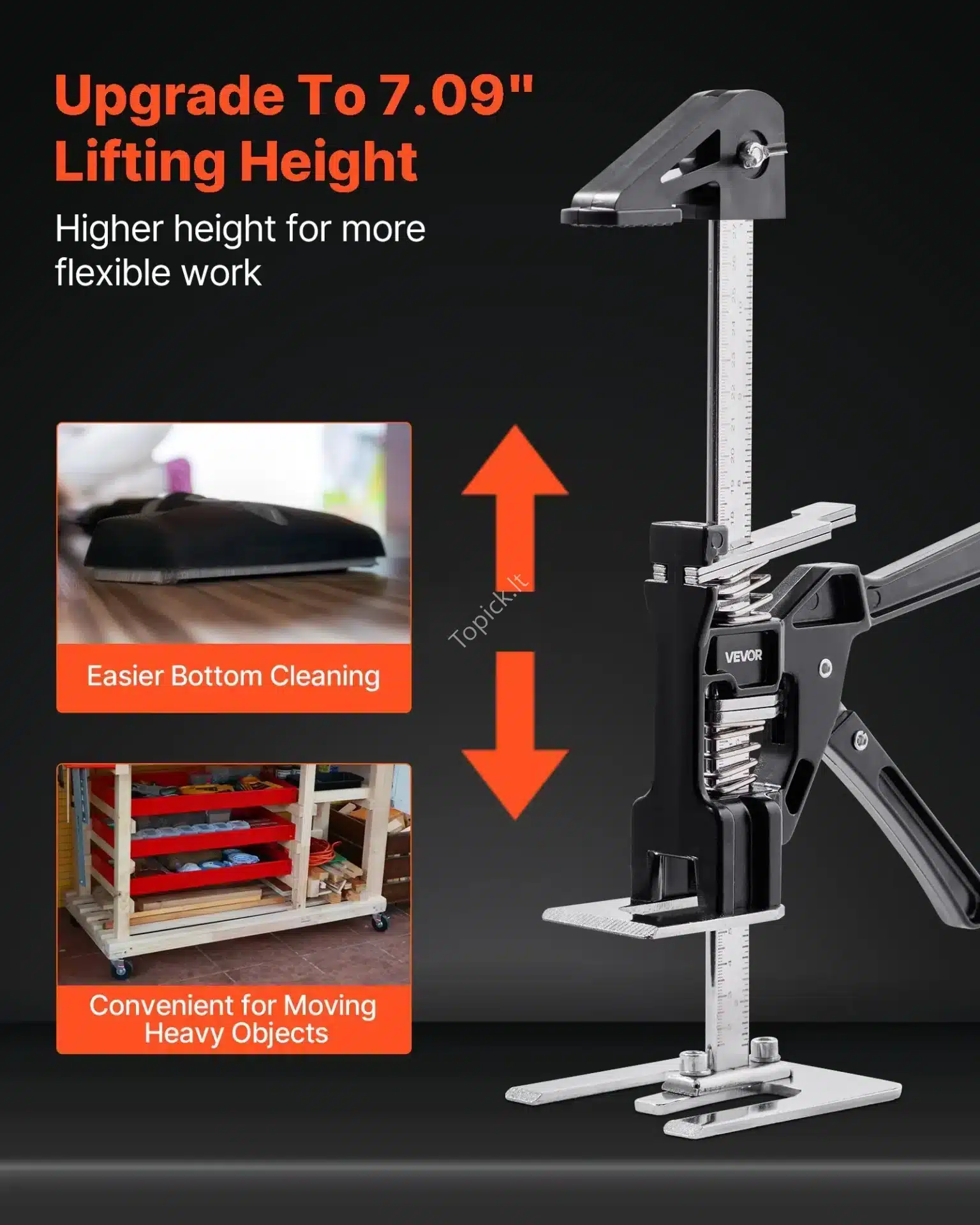 - Universalumas Darbui: Šis įrankis puikiai tinka ne tik gipso kartono plokštėms ar baldams, bet ir terasos lentoms, stiklo paketams, sunkiems prietaisams ir viskam, ką reikia tiksliai pakelti ar išlyginti.