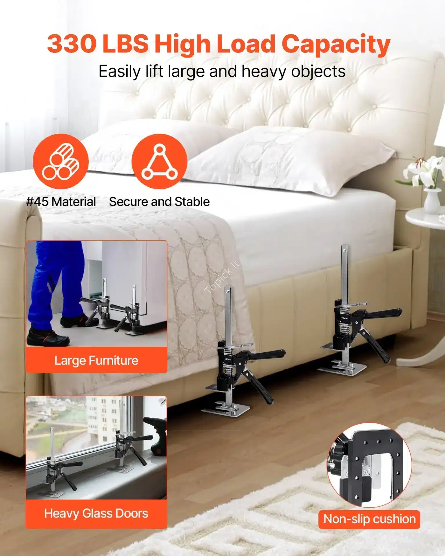 - Paprasta, bet Galinga: Nors konstrukcija kompaktiška, kiekvienas keltuvas sukurtas pakelti sunkų krovinį, o kartu jie stabiliai išlaiko iki 150 kg svorį. Tai tikrai pakankama galia daugeliui namų ir profesionalių montavimo darbų.