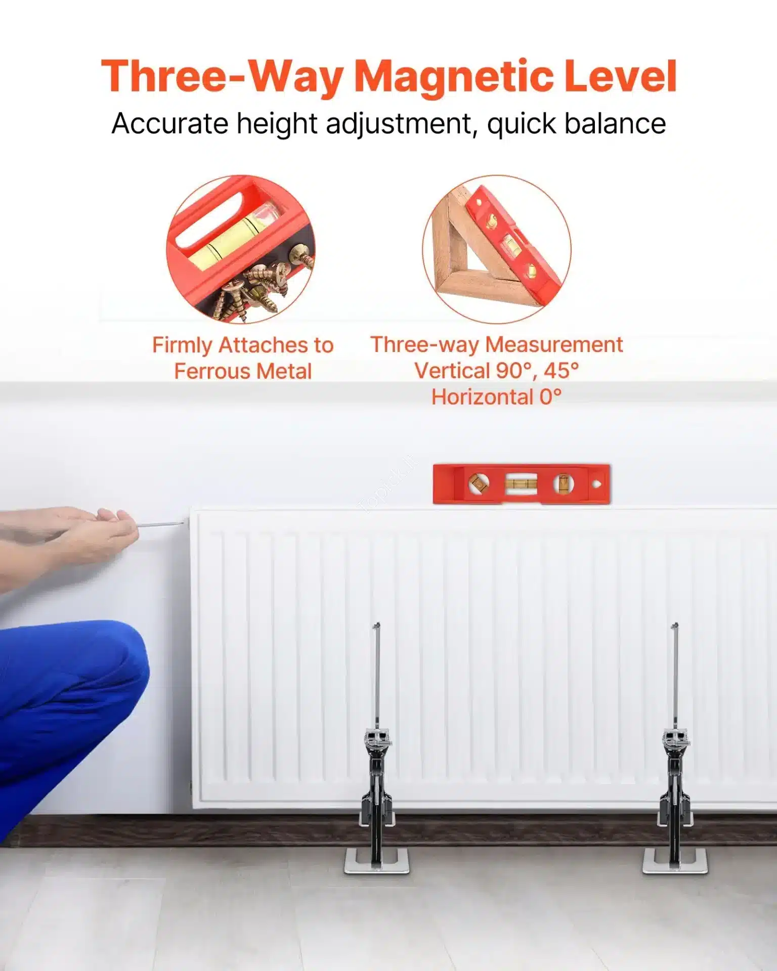 • Integruotas Magnetinis Gulsčiukas: Keltuvo viršuje esantis trijų krypčių magnetinis gulsčiukas (0°, 45°, 90°) leidžia ne tik pakelti, bet ir iškart tiksliai išmatuoti bei užfiksuoti krovinio lygį, kas yra kritiškai svarbu durų ar spintelių montavimui.