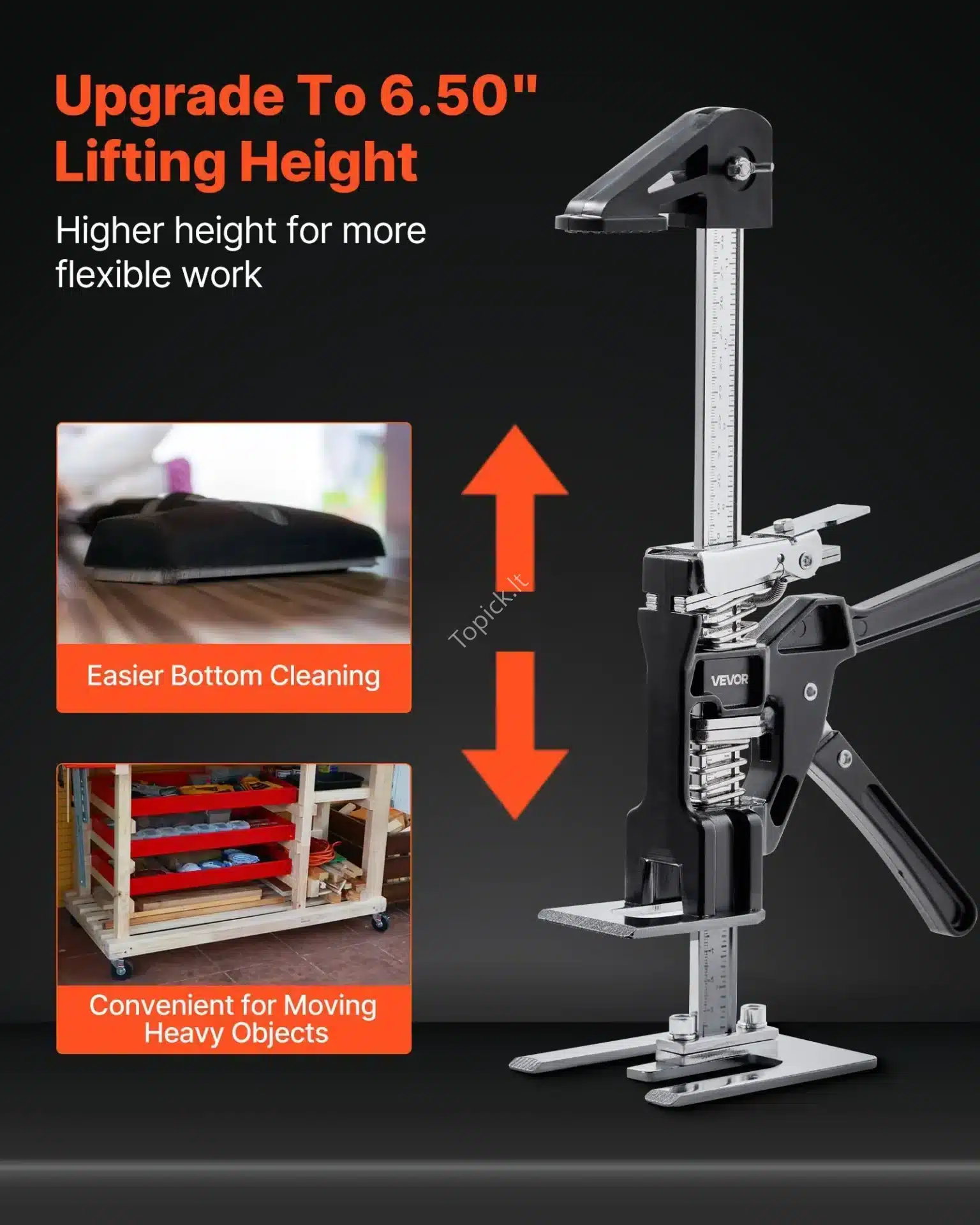 • Optimalus Kėlimo Aukštis: Keltuvai leidžia reguliuoti aukštį iki 165 mm (6,5 colio). Tai pakankamas aukštis daugeliui montavimo ir išlyginimo užduočių, užtikrinantis precizišką pozicionavimą.