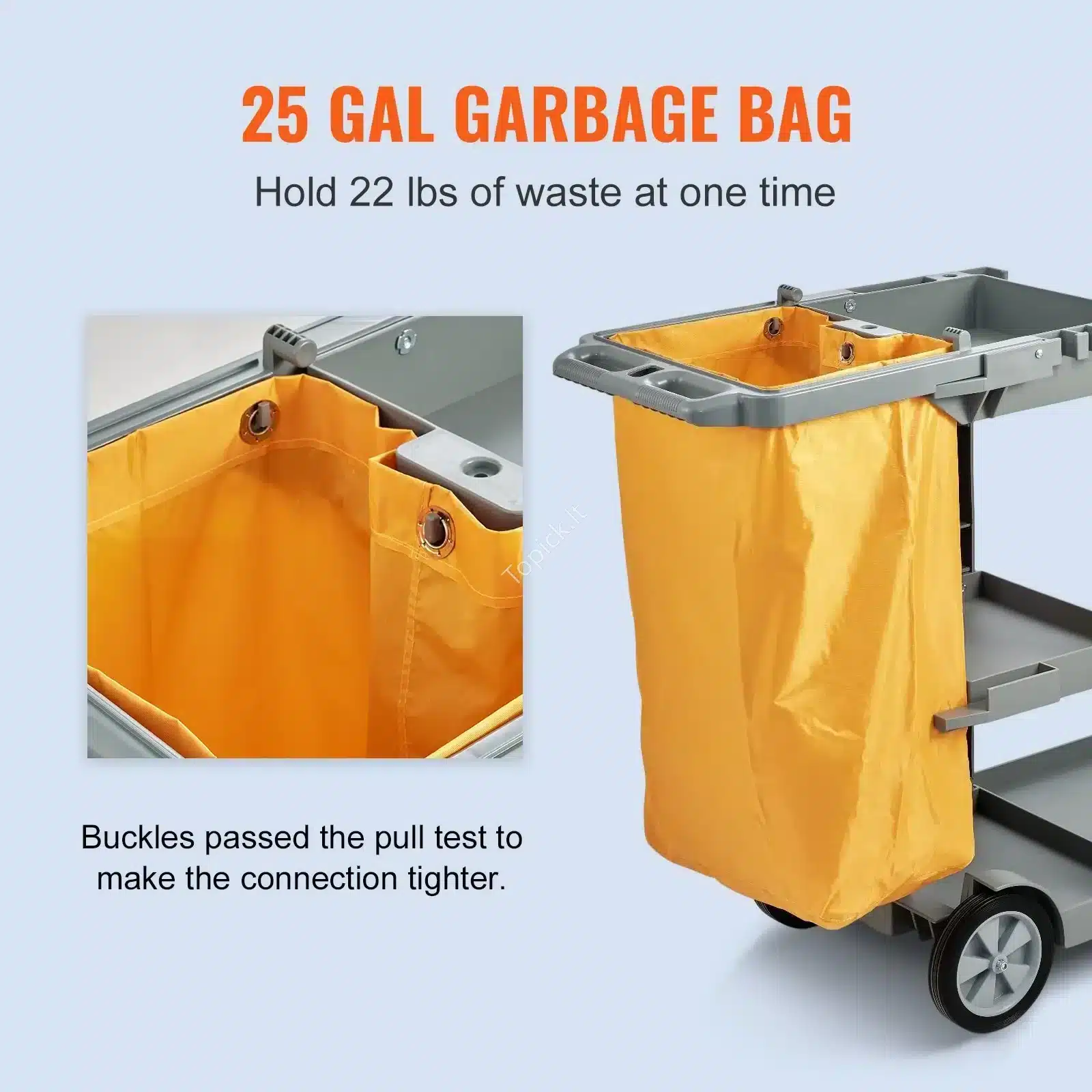 Profesionalus Valymo Vežimėlis 🧹 120 x 51 x 98 cm, 3 Lentynos, 90,7 kg Keliamoji Galia, 94,6 l (25 gal.) Šiukšlių Maišas, Viešbučio / Valymo Vežimėlis, Pilkas