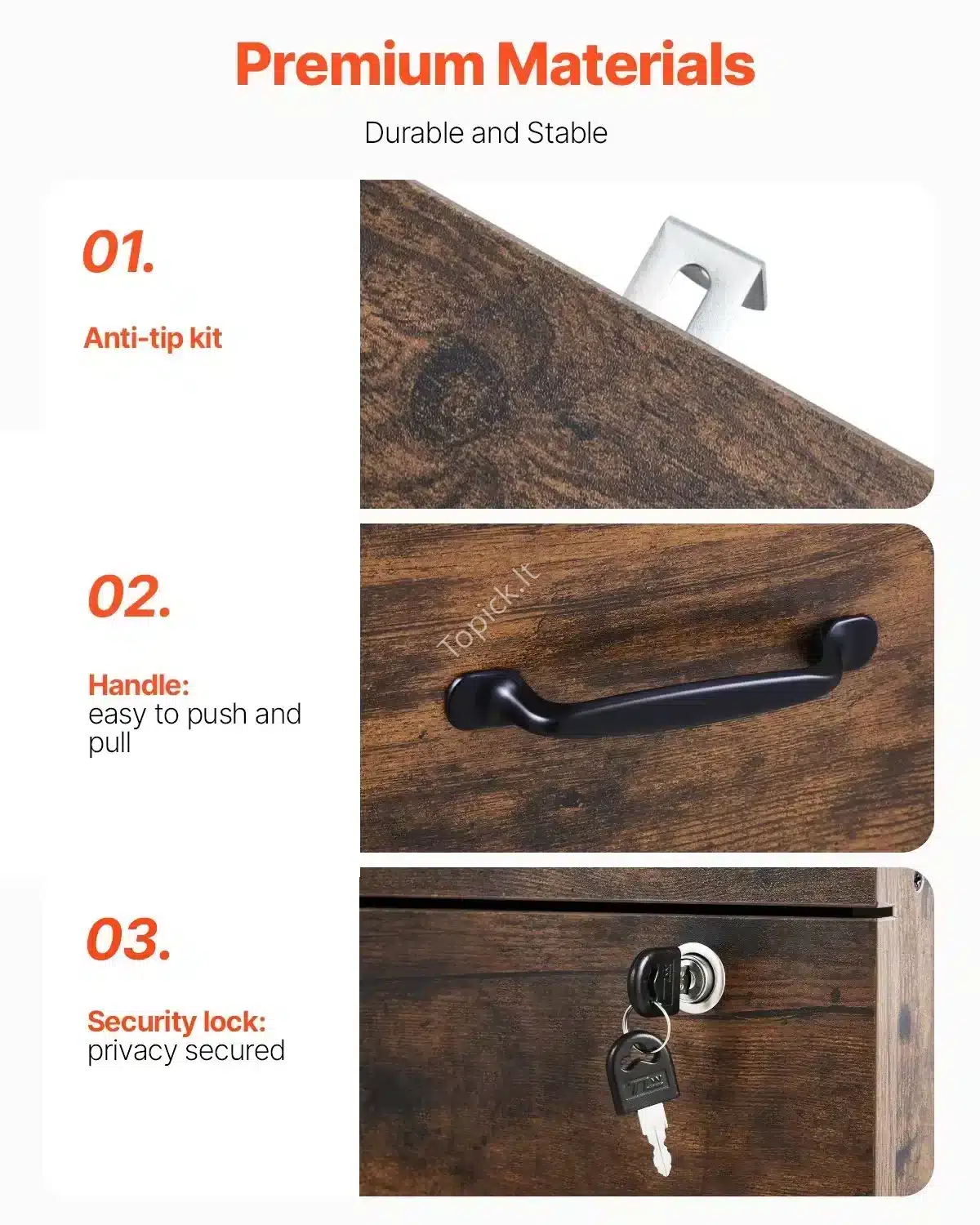 - Talpūs Vertikalūs Stalčiai: Spinta turi 3 didelius stalčius, idealiai pritaikytus A4 ir Letter formato dokumentams. Kiekviename stalčiuje rasi reguliuojamą pakabinamą strypą, leidžiantį tvarkingai sukabinti aplankus horizontaliai – tai maksimaliai palengvina dokumentų kategorizavimą ir paiešką!