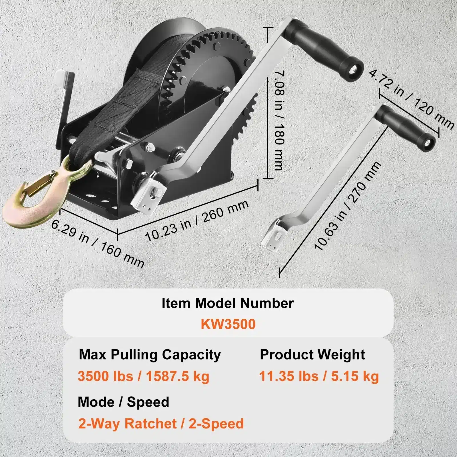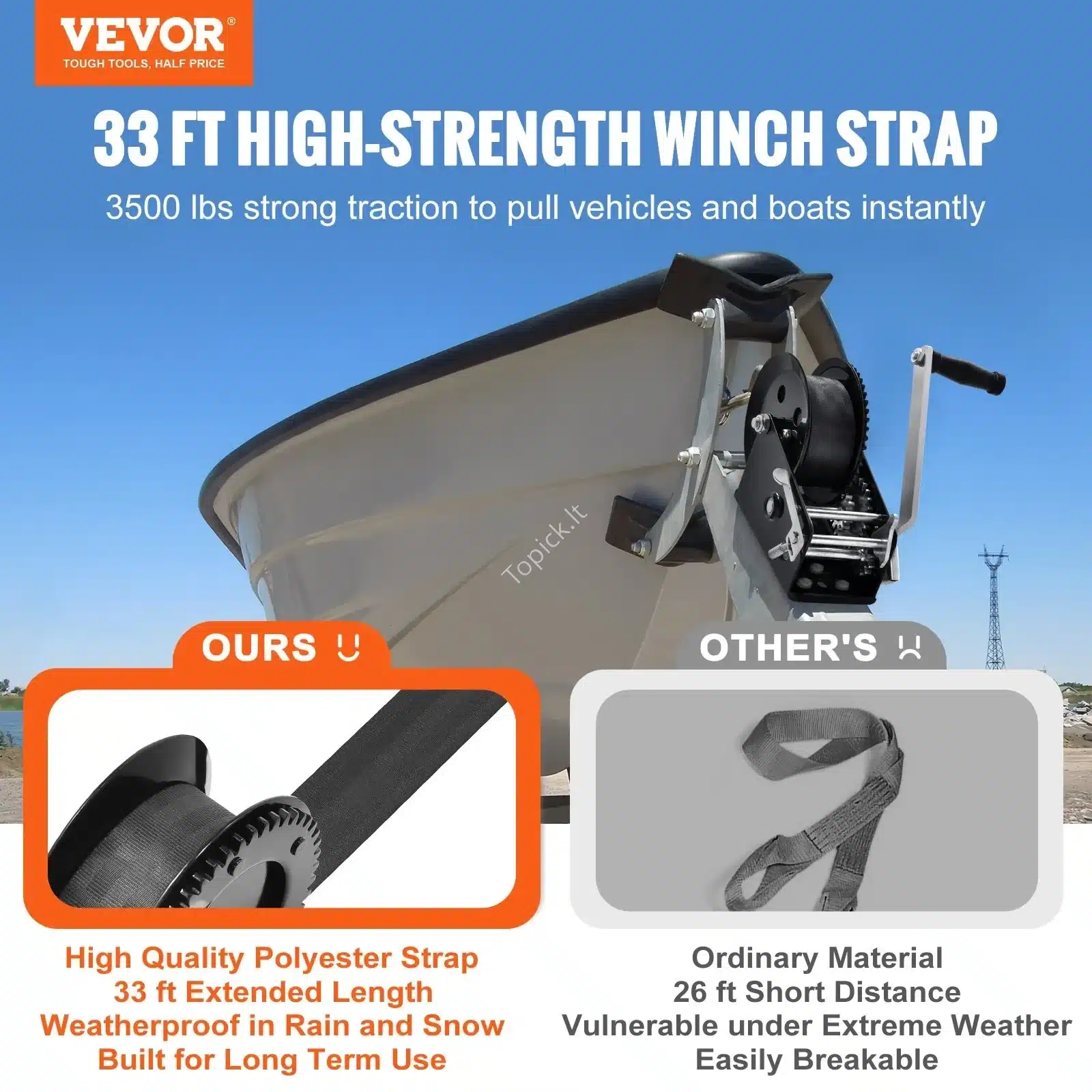 🔧 Rankinė gervė su 1587,5 kg traukos galia – 10 m poliesterio juosta, 2‑greičių spragtukas, ergonominė rankena 🚤💪
