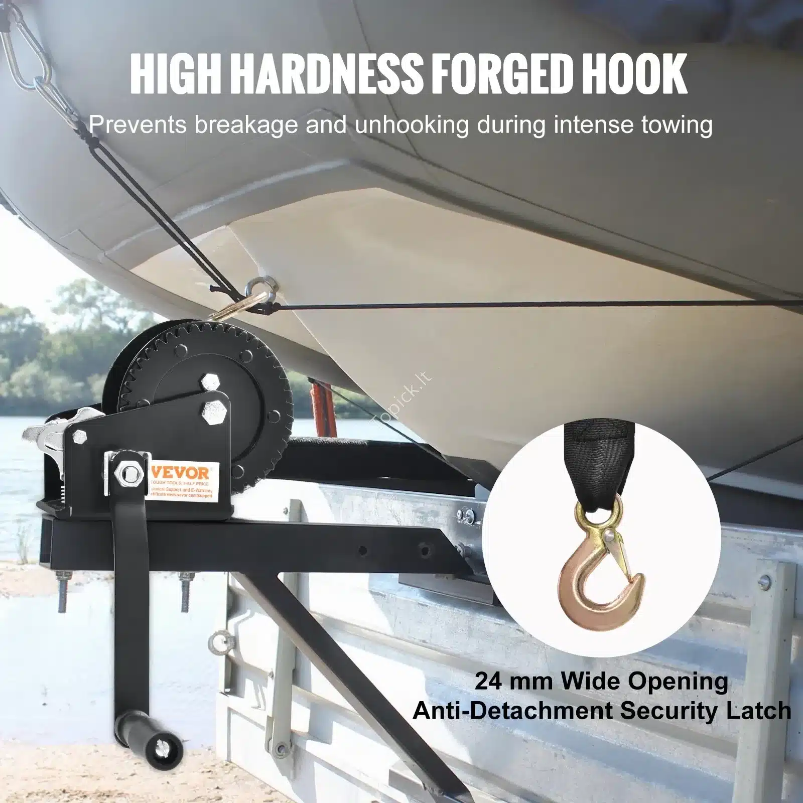 🔧 Rankinė gervė su 907,1 kg traukos galia – 7 m poliesterio juosta, 2‑greičių spragtukas, ergonominė rankena 🚤💪