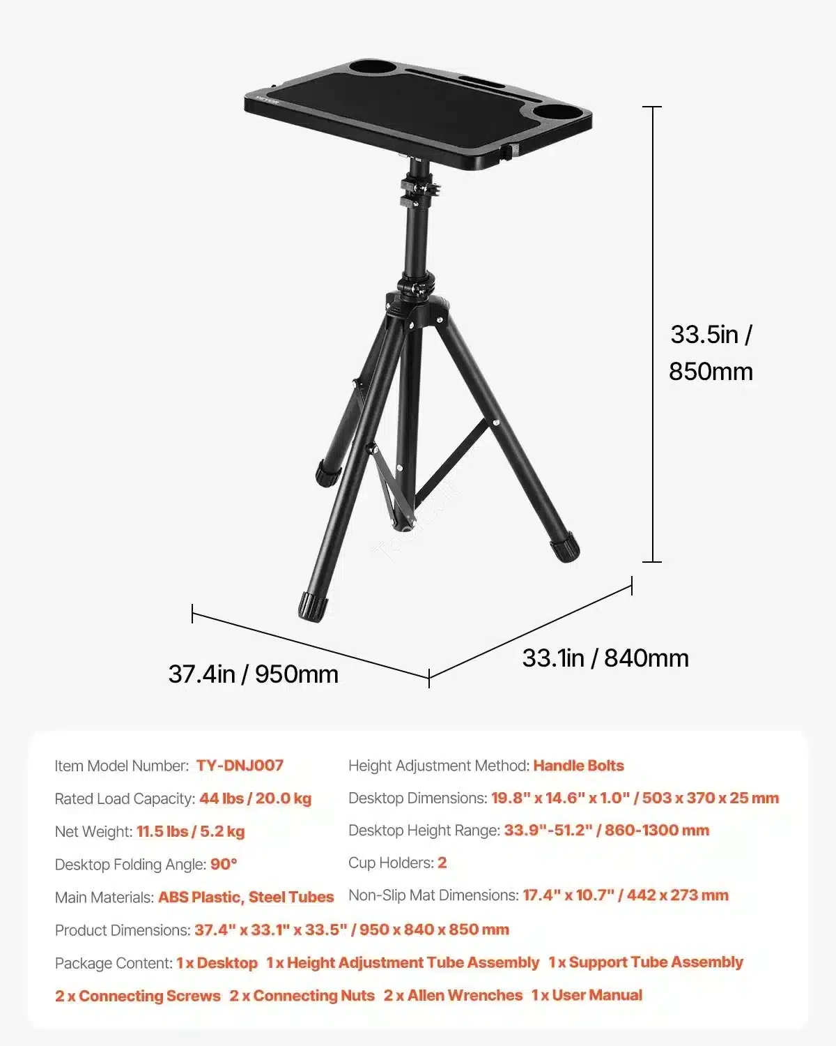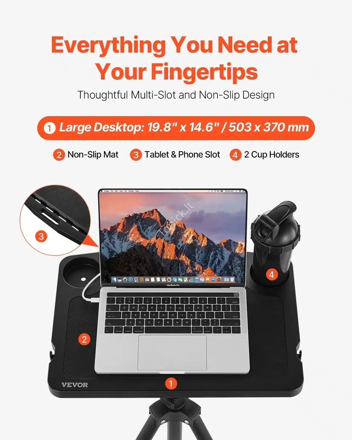• Erdvė Jūsų Prietaisams: Stalviršis turi neslystantį kilimėlį jūsų įrenginiams saugoti, specialias angas planšetėms ir telefonams, taip pat dvi vietas puodeliams ar gertuvėms – viskas pasiekiama ranka.