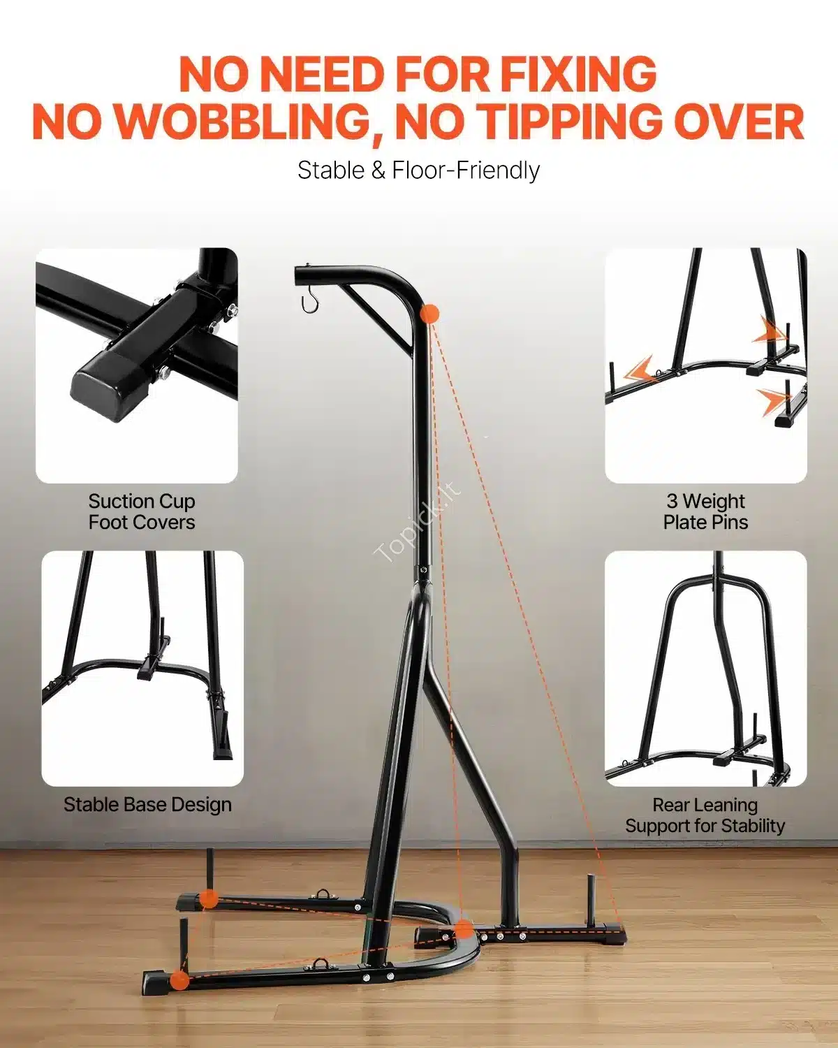 - Stabilus Pagrindas: Trikampis pagrindas su guminiais siurbimo padais užtikrina, kad stovas išliks stabilus. Svarbu: stabilumui padidinti labai rekomenduojama pridėti svorio plokštes ant specialių vietų pagrindo vamzdžiuose (plokštės parduodamos atskirai).