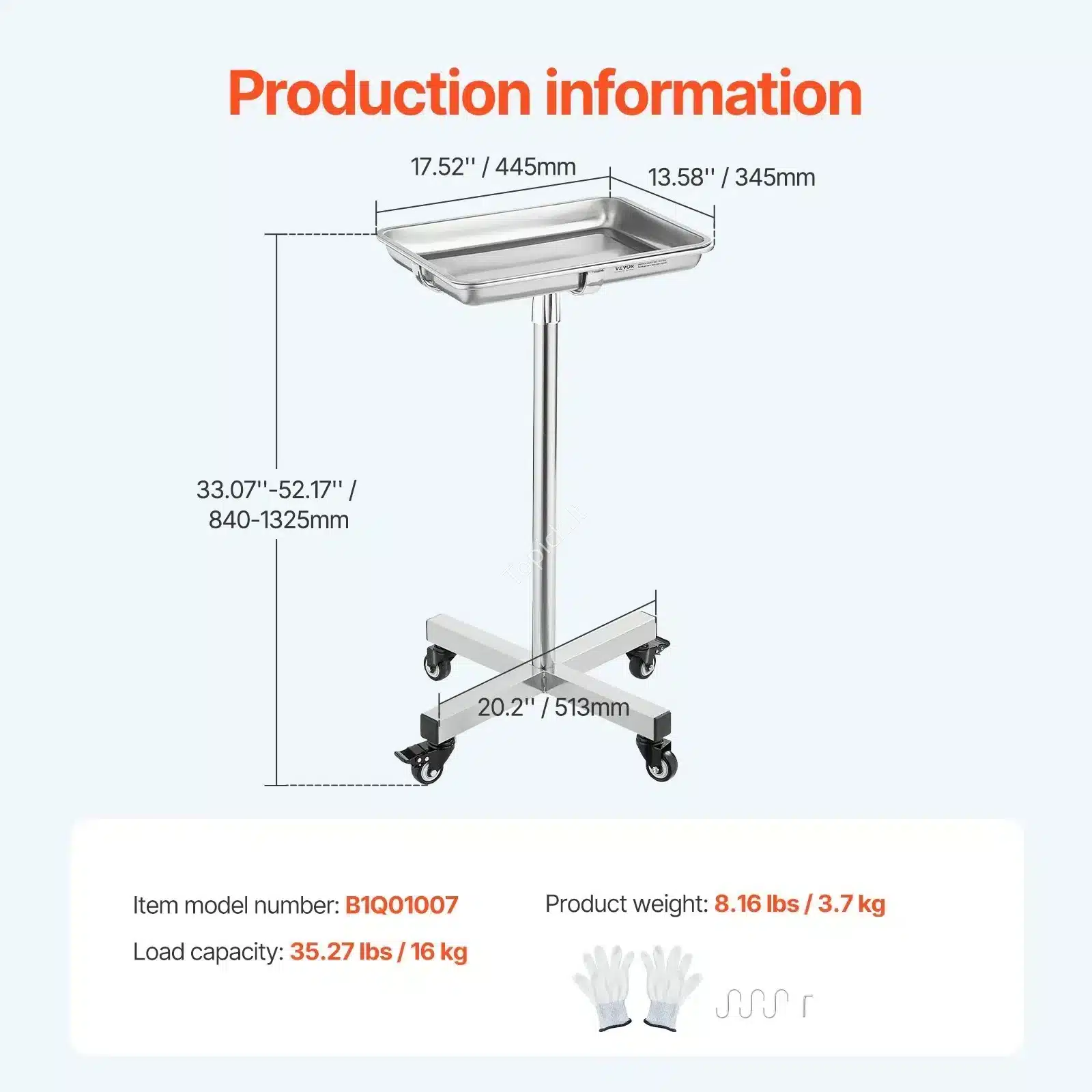 Matmenys: Vežimėlio matmenys: 515 x 515 mm. Reguliuojamas aukštis: nuo 840 mm iki 1325 mm. Medžiaga: 201 Nerūdijantis Plienas / PU (ratukai). Svoris: 3,7 kg.