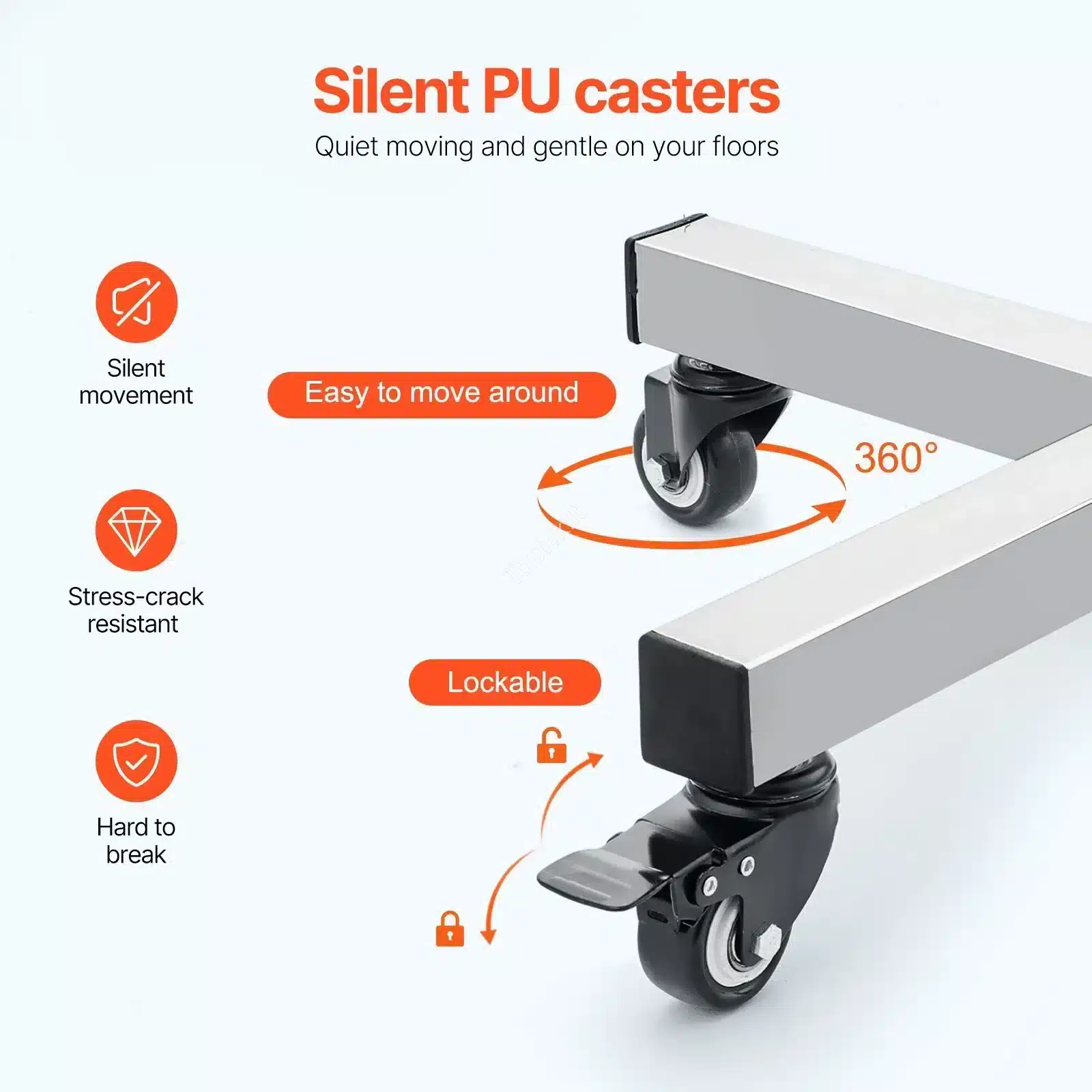 - 🔇 Tylūs Ratukai su Stabdžiais: 4 aukštos kokybės PU pasukami ratukai leidžia vežimėlį judinti tyliai ir lengvai. Du ratukai turi stabdžius, kurie fiksuoja vežimėlį vietoje, garantuojant saugumą ir stabilumą dirbant.