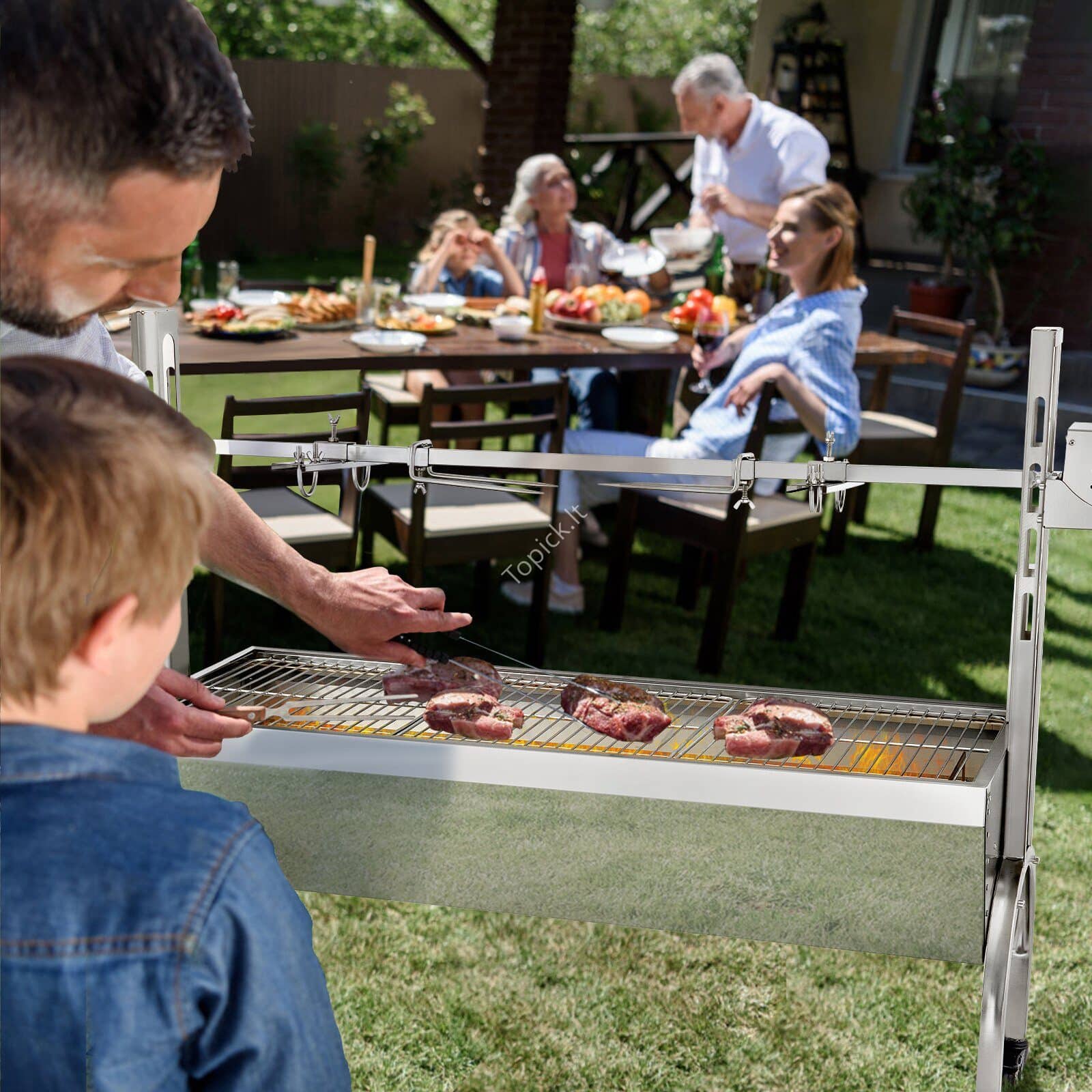 - Įvairūs pritaikymai: ši elektroninė automatinio sukimosi konstrukcija tinka dideliems šeimos susibūrimams, iškyloms lauke ir stovyklavimui. Sumontuotas paprastais veiksmais, jį galima iš karto paruošti skaniems patiekalams, tokiems kaip filė mijonas, dešrainiai, sūris, bulvės, kalakutiena, svogūnai ir krevetės.