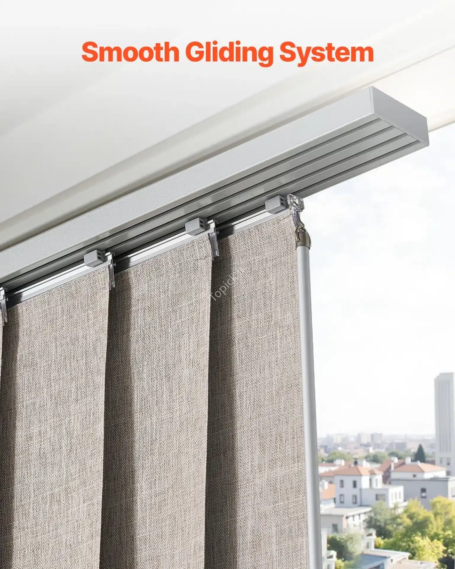 Komplekte esantis aliuminio lydinio bėgelis yra reguliuojamas nuo 116 iki 218 cm pločio, todėl tinka skirtingo dydžio angoms. Panelės gali būti lengvai kerpamos, kad puikiai atitiktų norimą aukštį. Žaliuzės juda tyliai ir sklandžiai, o sumontuotas dekoratyvinis profilis paslepia bėgelį, suteikdamas estetišką ir užbaigtą išvaizdą.