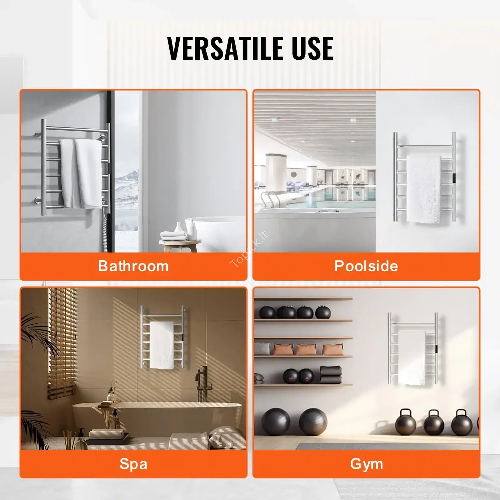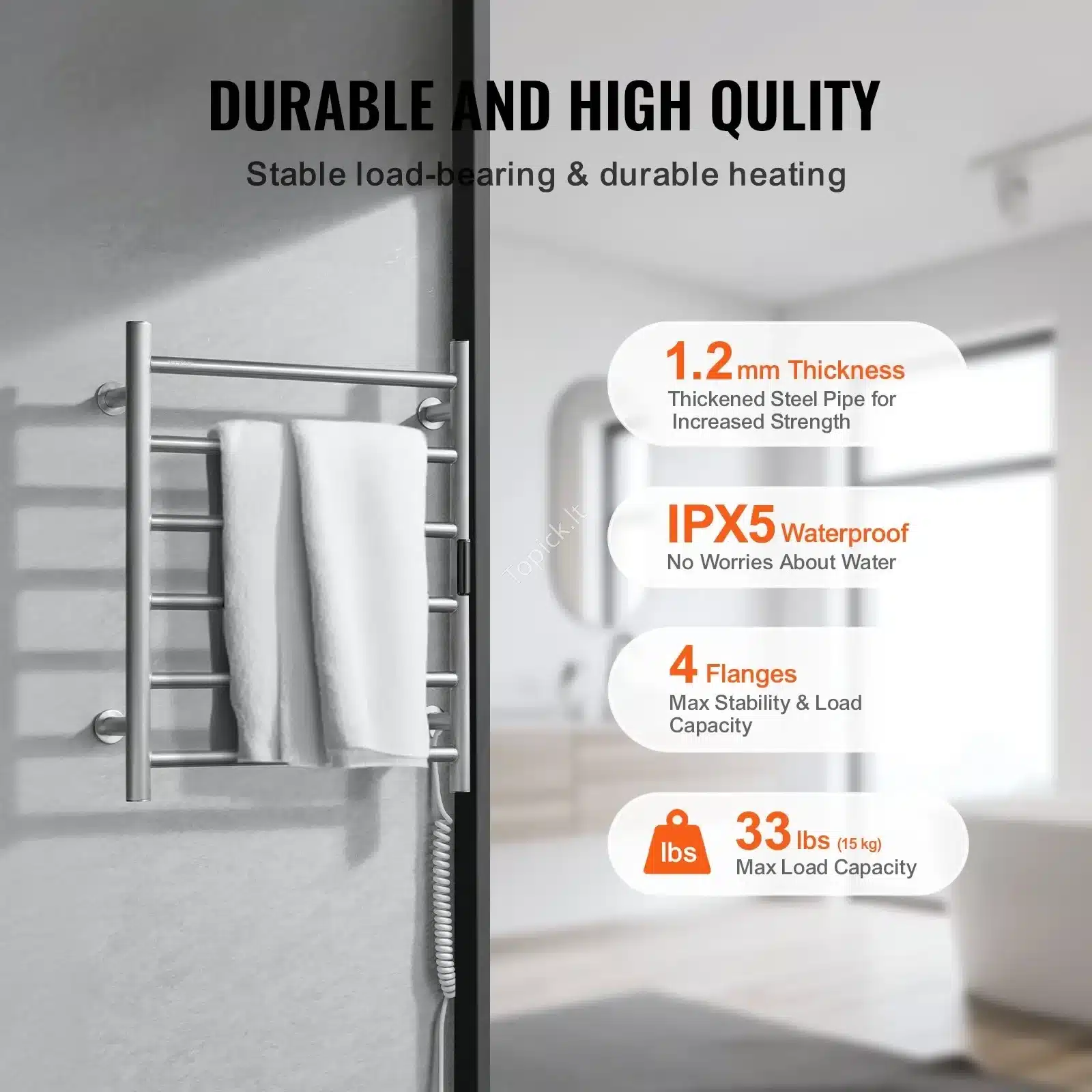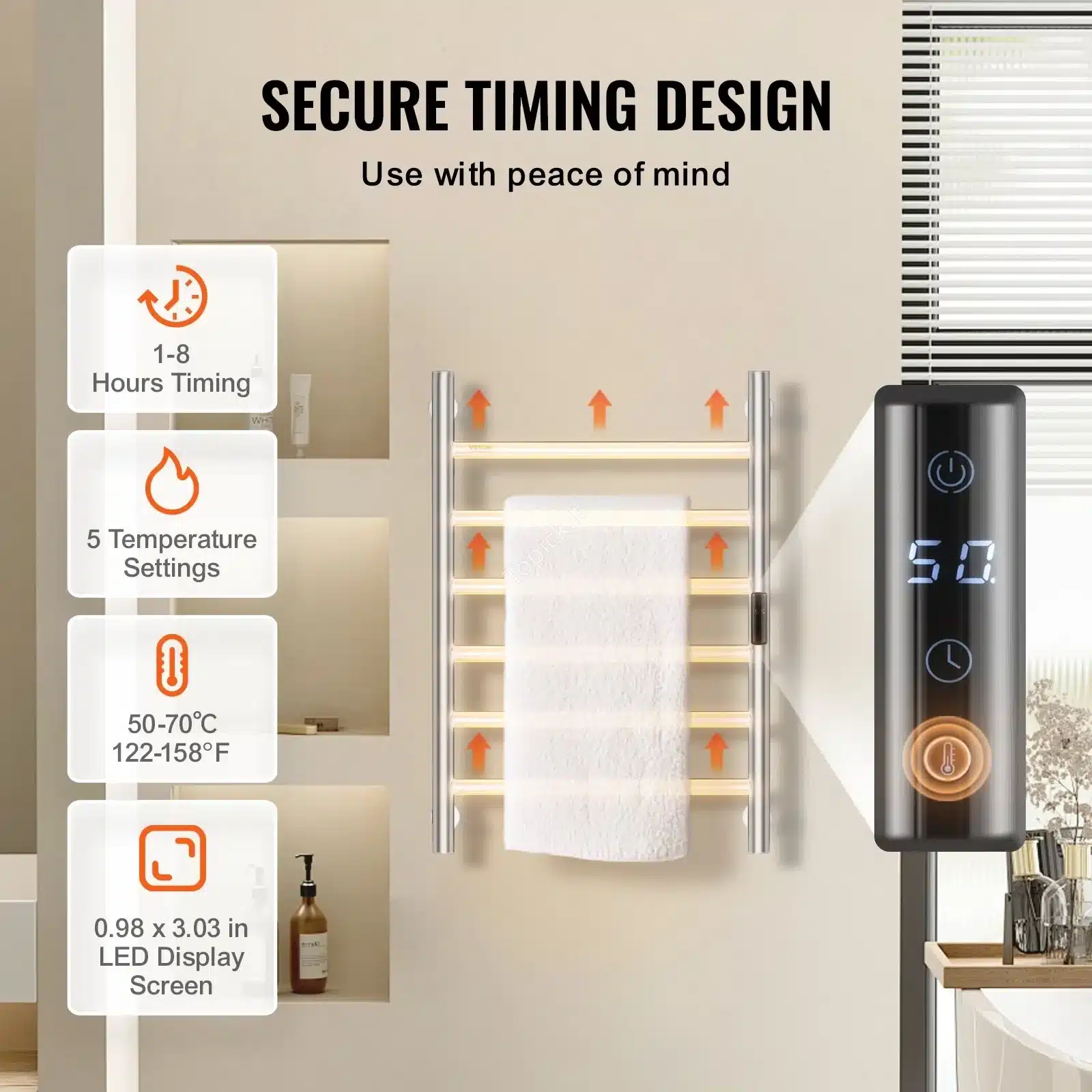- Išmanusis laikmatis Įmontuotas 1-8 valandų laikmatis leidžia nustatyti, kada prietaisas turi veikti, užtikrindamas, kad rankšluosčiai bus šilti ir sausi būtent tada, kai to norėsite, taip pat padės taupyti elektros energiją.
