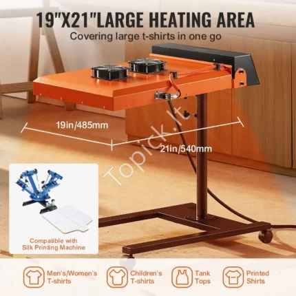 - Reguliuojamas ir Mobilus: Dėl reguliuojamo aukščio lengvai pritaikysi džiovintuvą prie savo šilkografijos mašinos, o 360° besisukanti kaitinimo galva ir ratukai su stabdžiais leidžia jį be vargo pastatyti ten, kur labiausiai reikia.