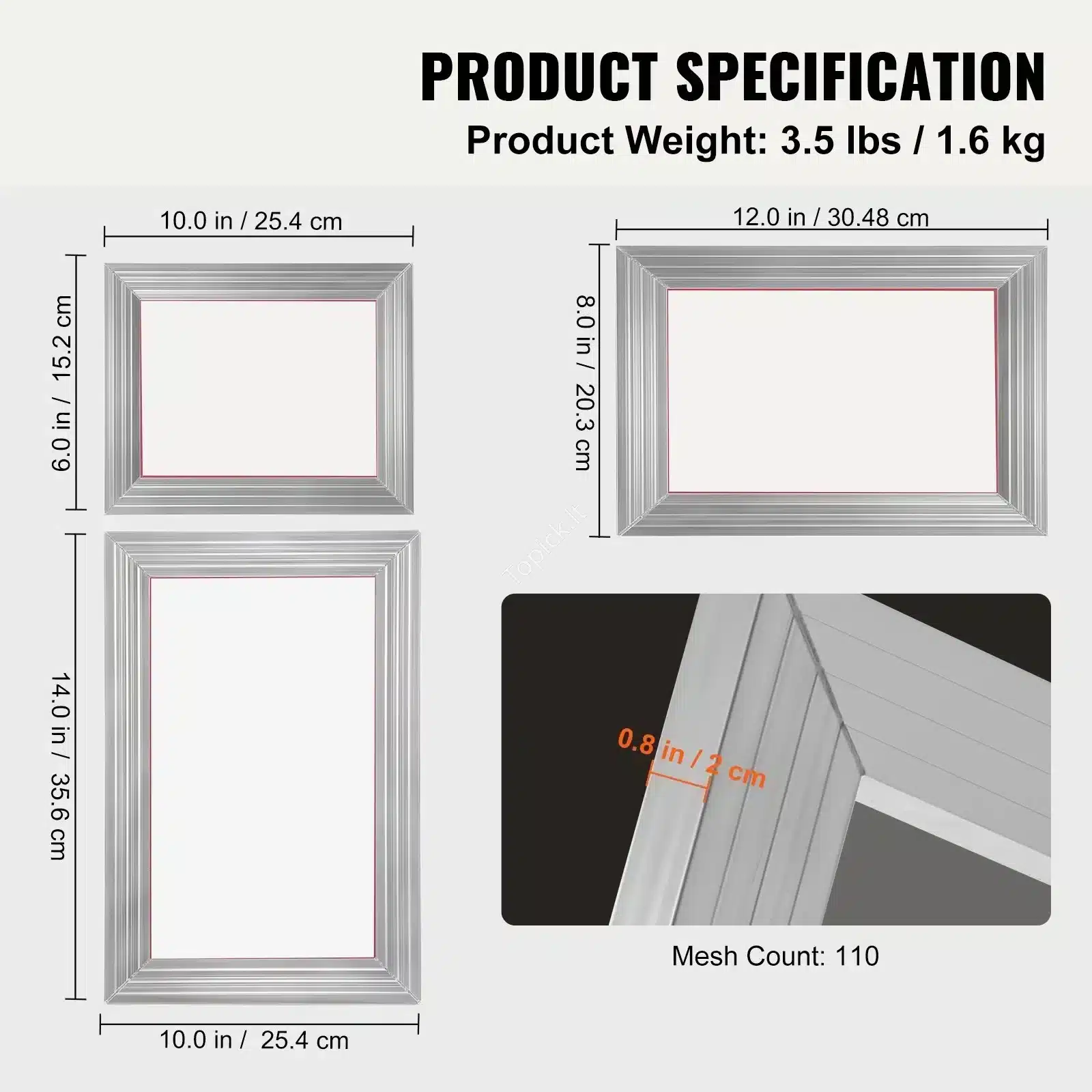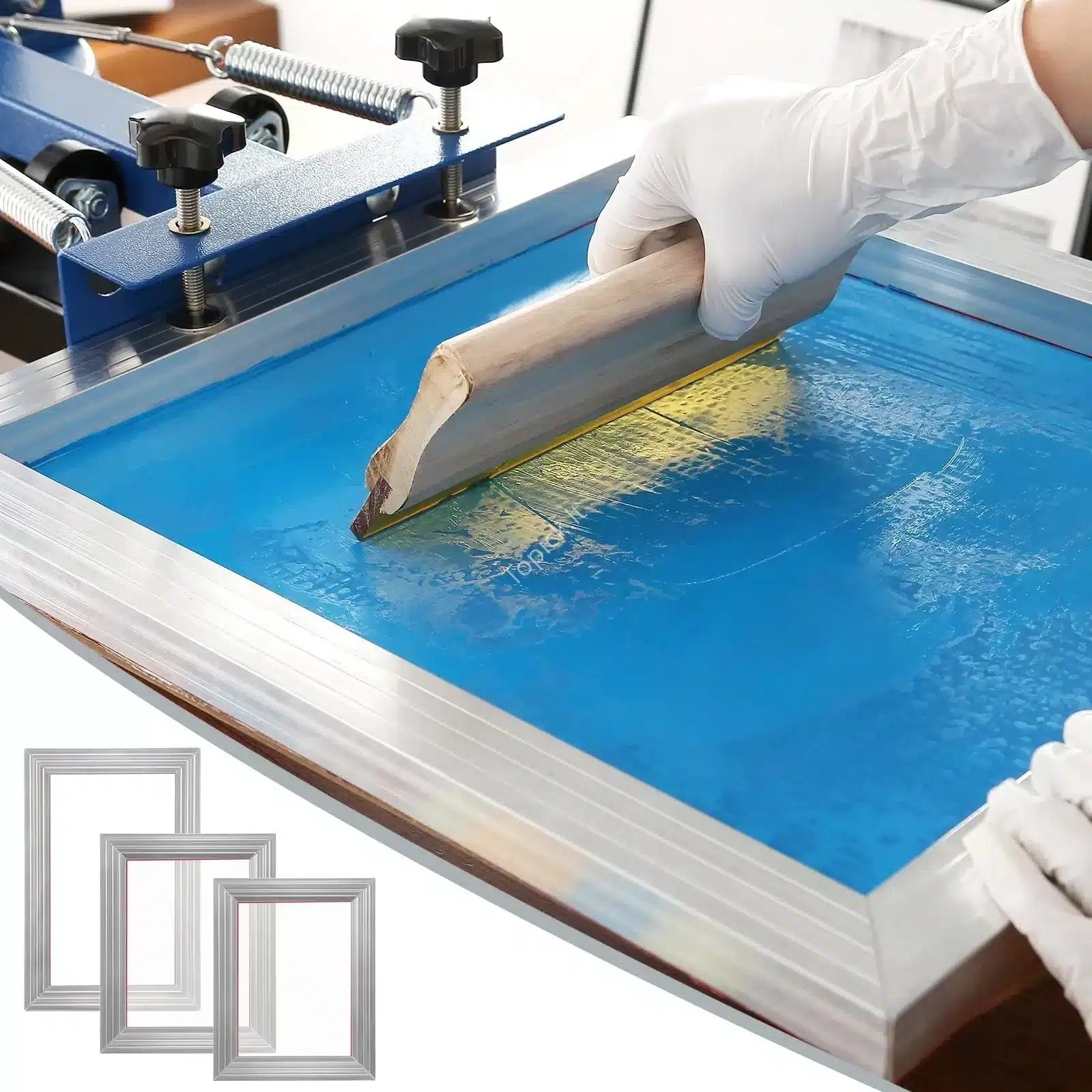- 3 vnt. Aliuminio šilkografijos rėmeliai (skirtingi dydžiai su 110 mesh).