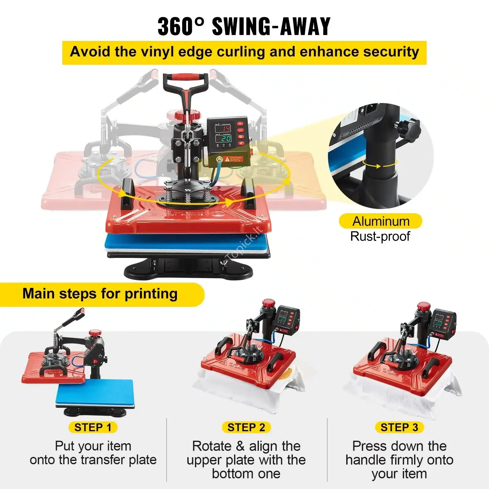- Komplekte: T-shirt presas, puodelių, kepurių, lėkščių, batų spaudos moduliai (10-in-1)