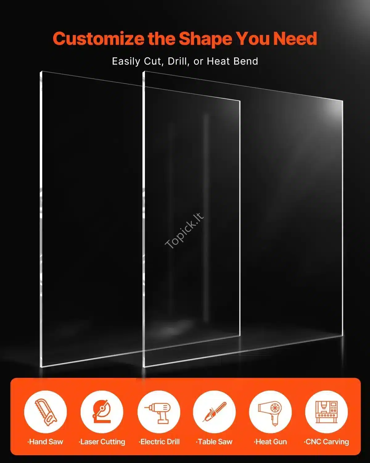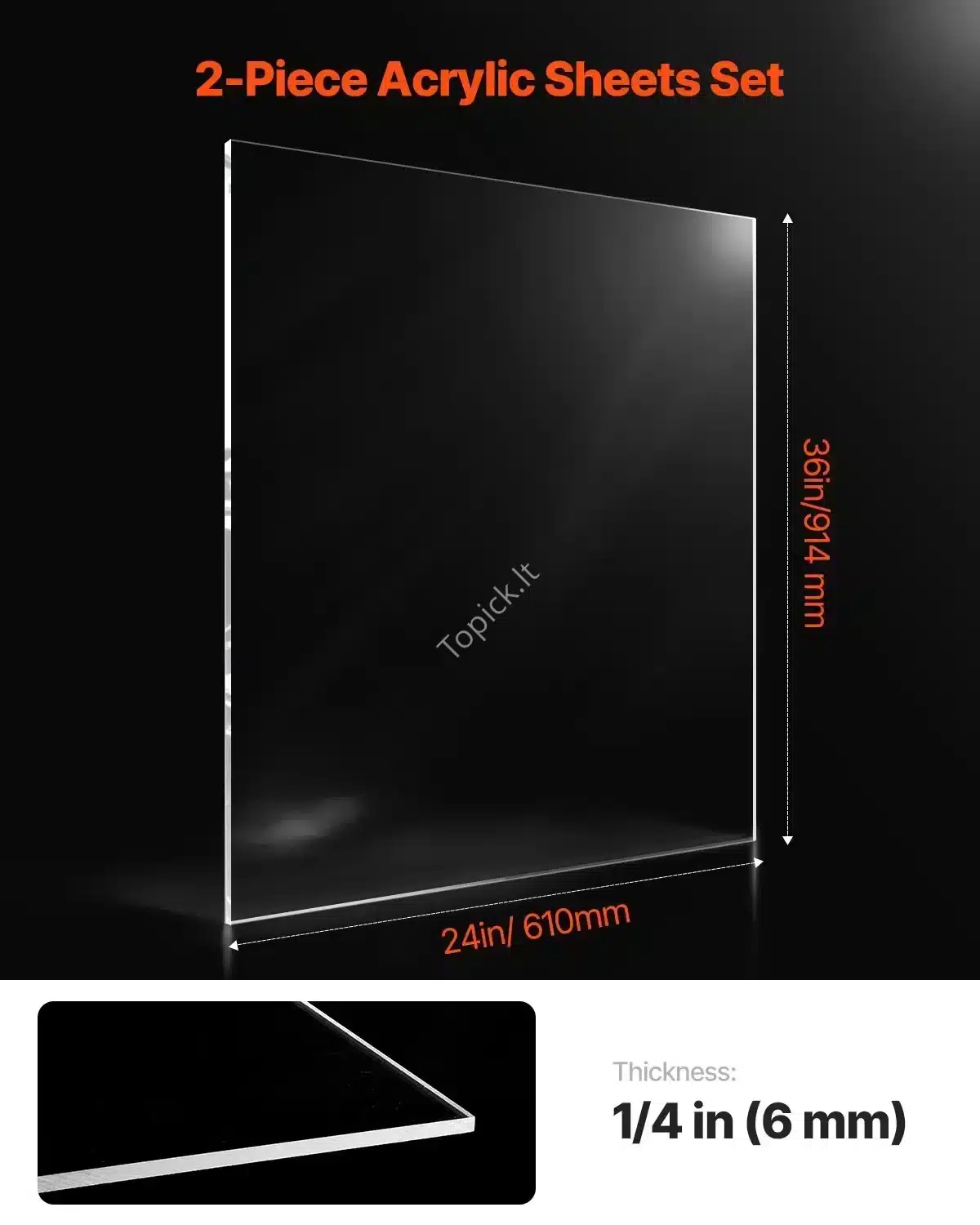 Ieškai patvaresnės, lengvesnės ir skaidresnės stiklo alternatyvos savo projektams? Šis 2 vienetų akrilo (Plexiglas) plokščių rinkinys puikiai tiks! Tai idealus sprendimas vitrinoms, paveikslų rėmų stiklo pakeitimui, apsauginėms pertvaroms ar bet kokiems „Pasidaryk Pats” kūrybiniams sumanymams.