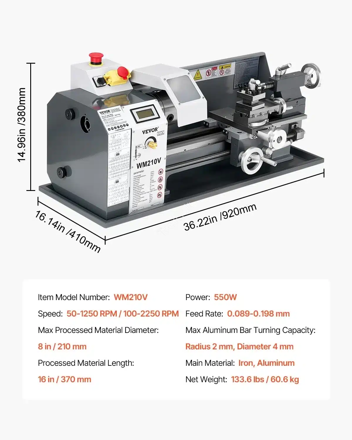 • Matmenys: Maksimalus ruošinio skersmuo – 210 mm, ilgis – 370 mm.