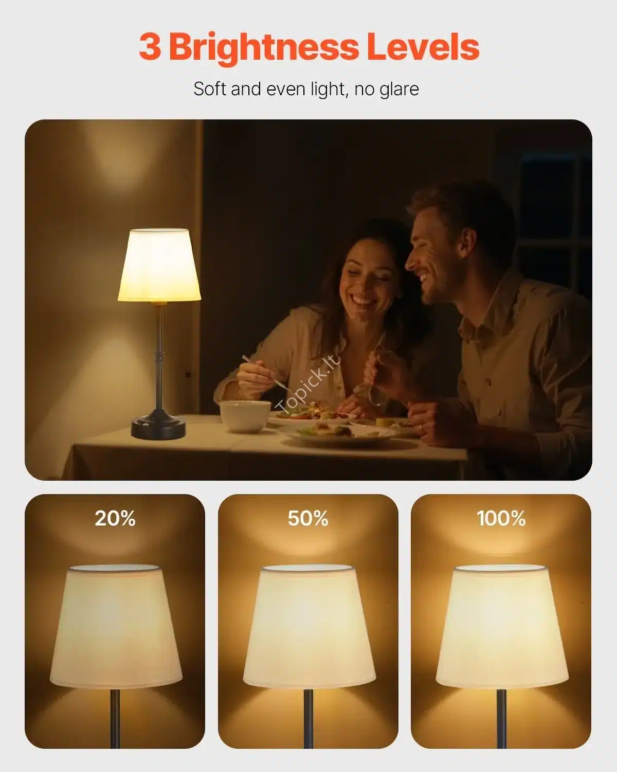 Ryškumo reguliavimas: nuo 20 % iki 100 % – pritaikoma skaitymui, darbui ar jaukiam vakaro apšvietimui ✨